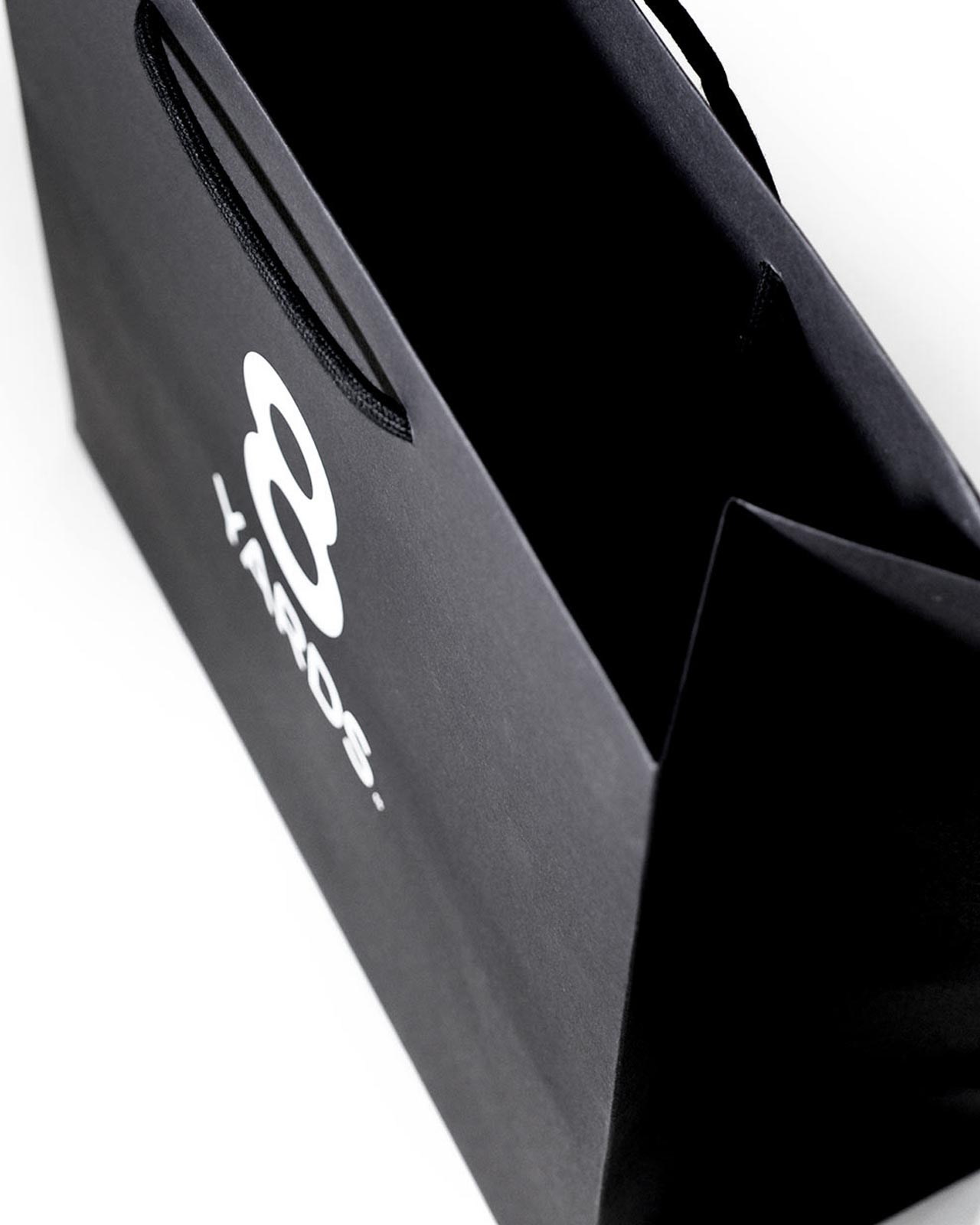 極厚でマットな紙質、そして袋の中までブラックで統一された高級感のある手提げ袋。