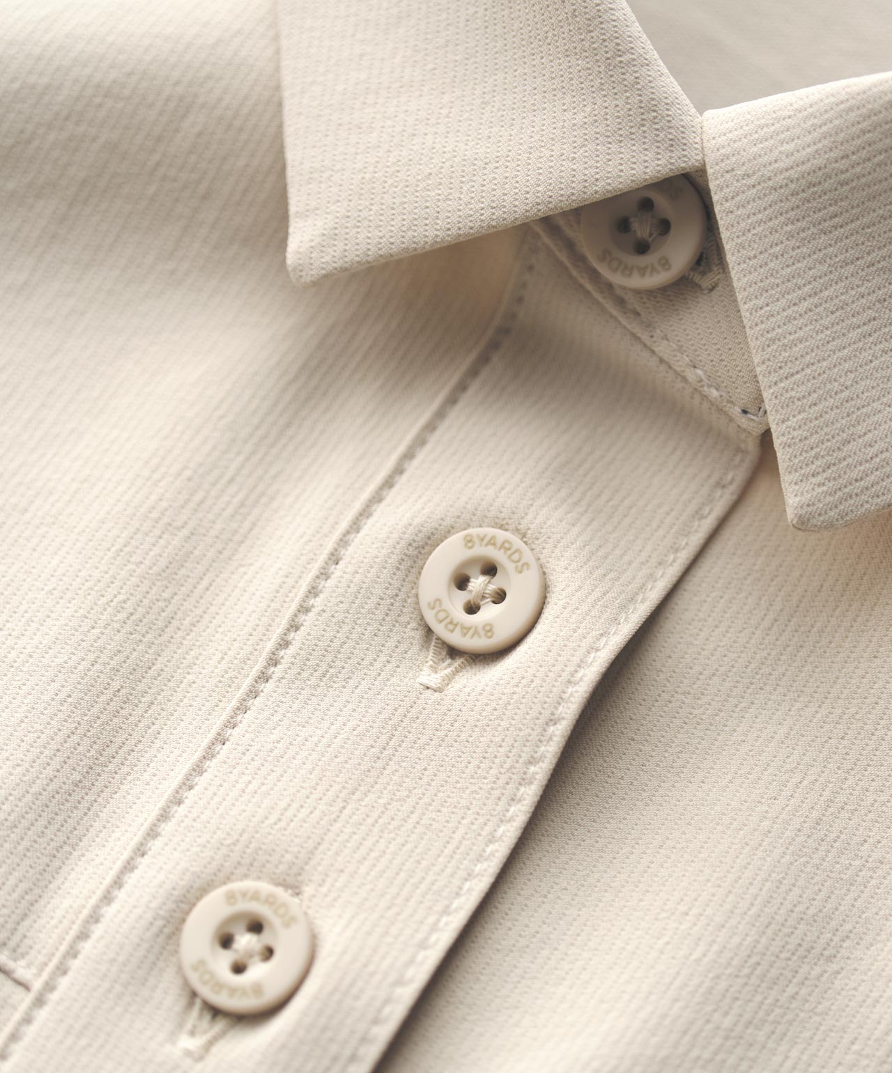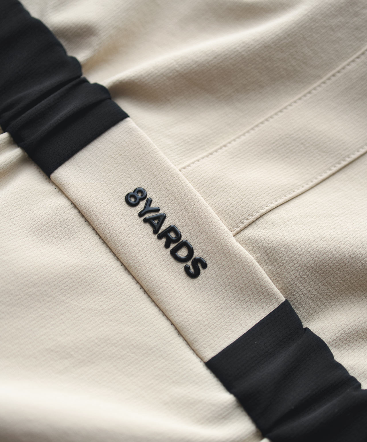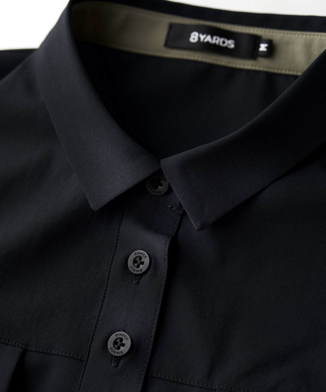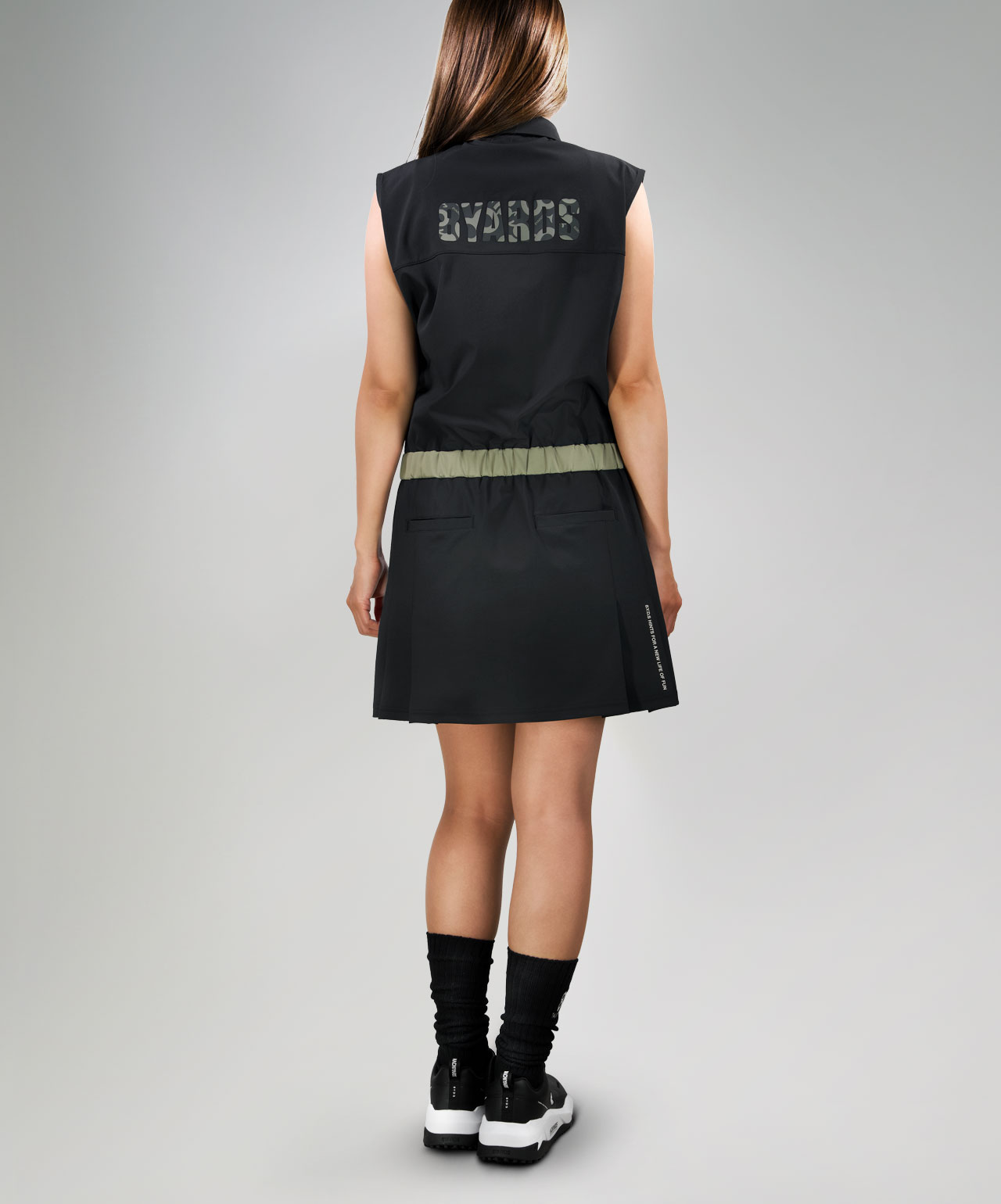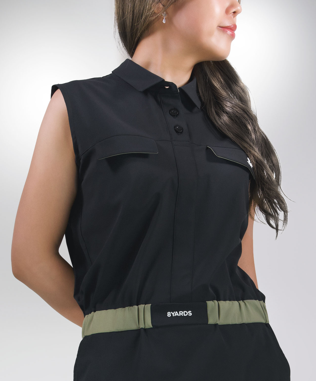 胸元のフラップポケットにはCaddieBee、ウエスト部分には8YARDSの立体パーツをそれぞれ配置。背面のプリーツや襟元のディテールが全体を引き締めるデザインワークで、カジュアルとしっかりがバランスよく同居。スタイリッシュで秋を感じる大人シルエットなワンピースに仕上げました。
