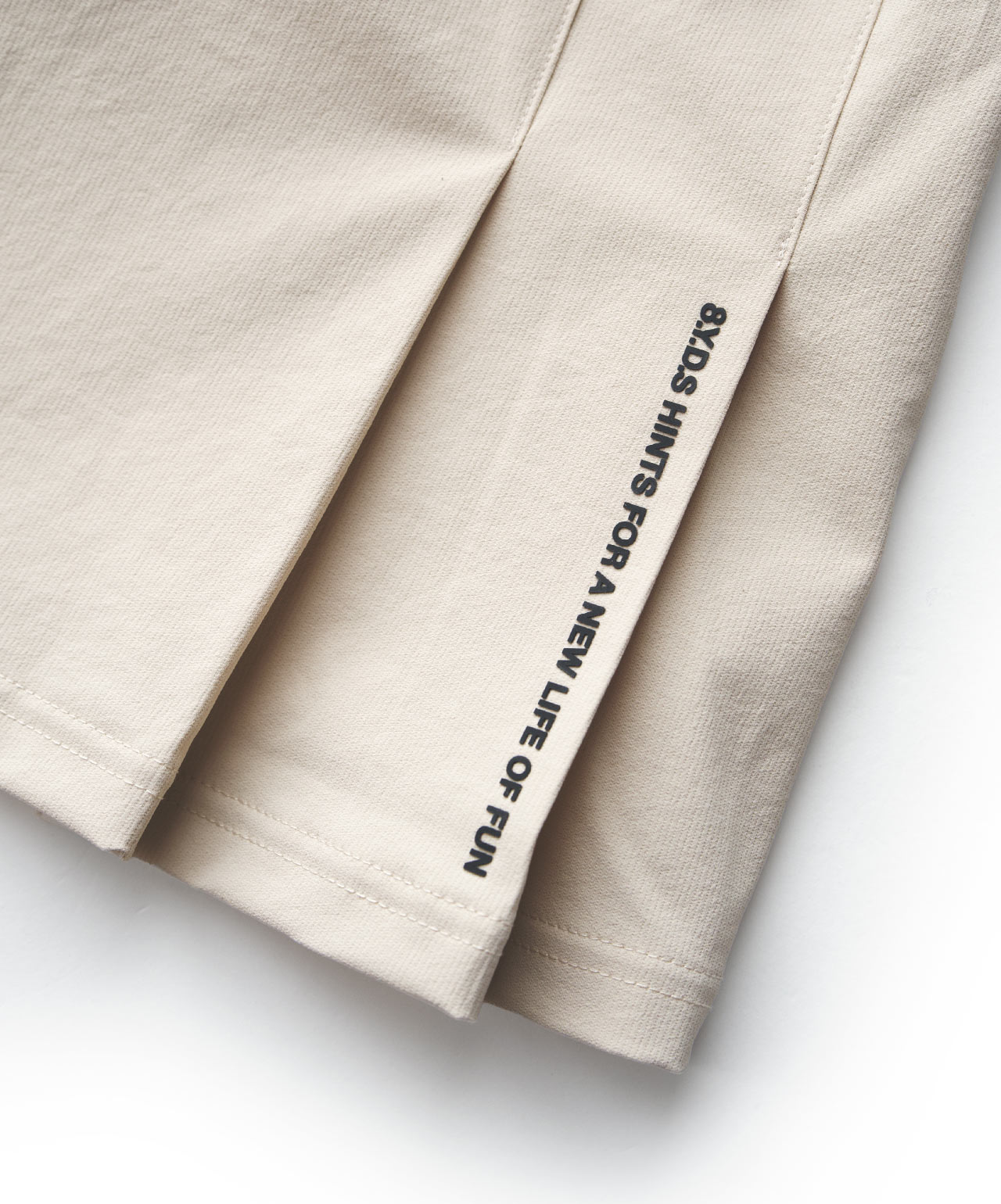 フロントには角丸処理した印象的なフラップポケット。ウエストは配色を効果的に取り入れたウエストゴム仕様がボディに優しくフィットし、計算されたディテールで間延びしない美しいシルエットを形成します。