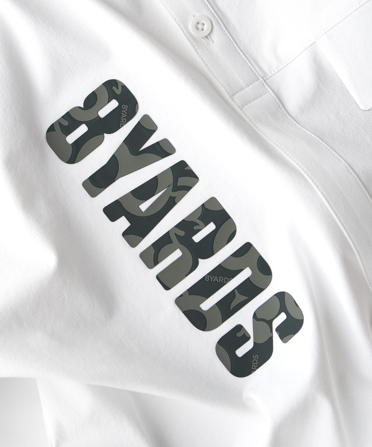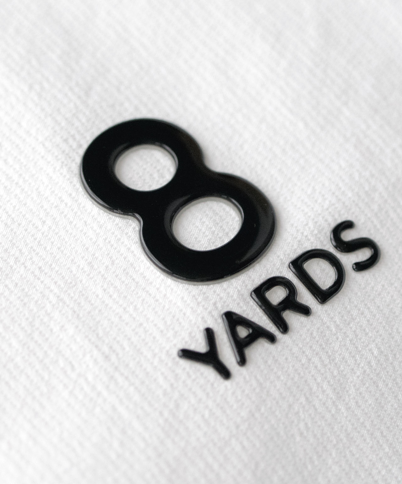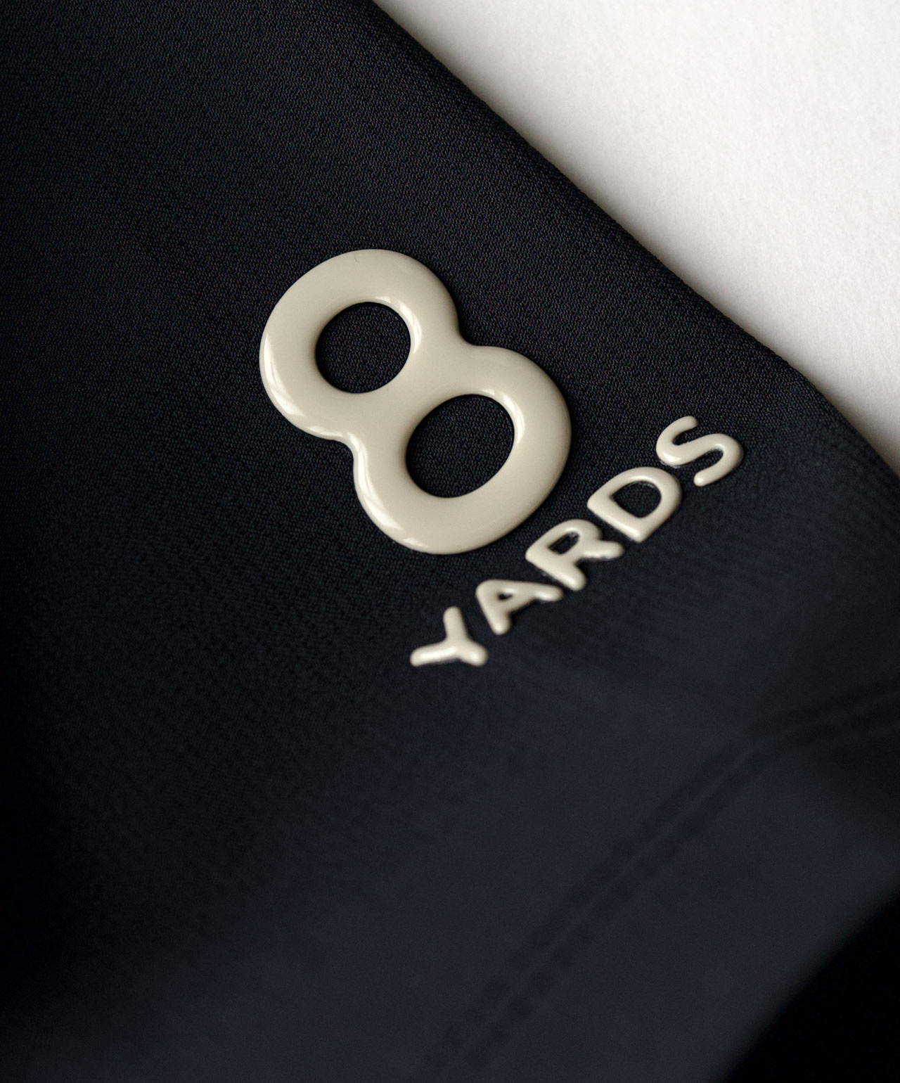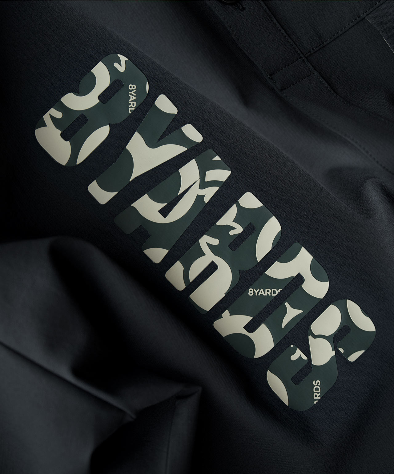 背面の裾にはインパクトのある配色を入れ、ヨーク部分には8YARDSの代名詞TAGLINEをシリコンで配置。胸元にはフラップポケットが付属し、フラップ部分にワンポイントでCaddieBee、右袖口にオフィシャルな8YARDSロゴをそれぞれ立体パーツで入れ"らしさ"を付加しました。