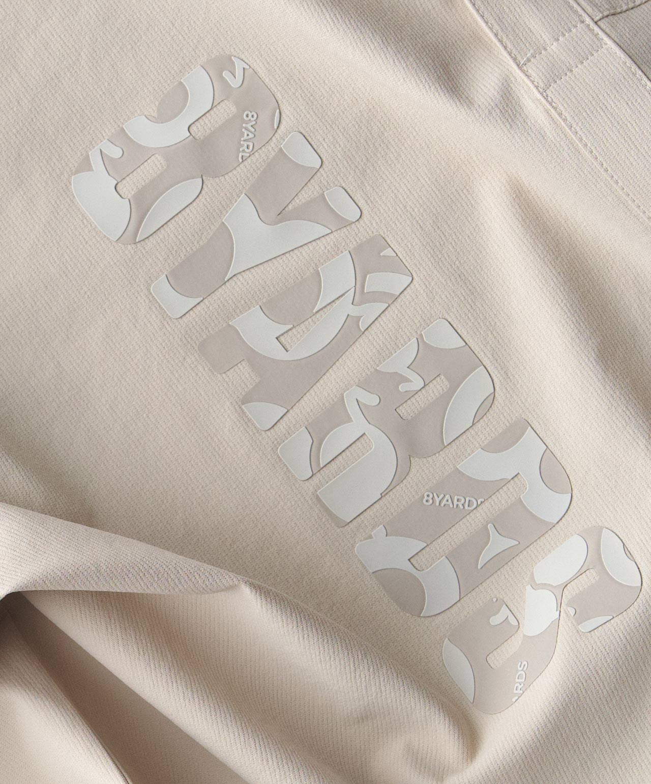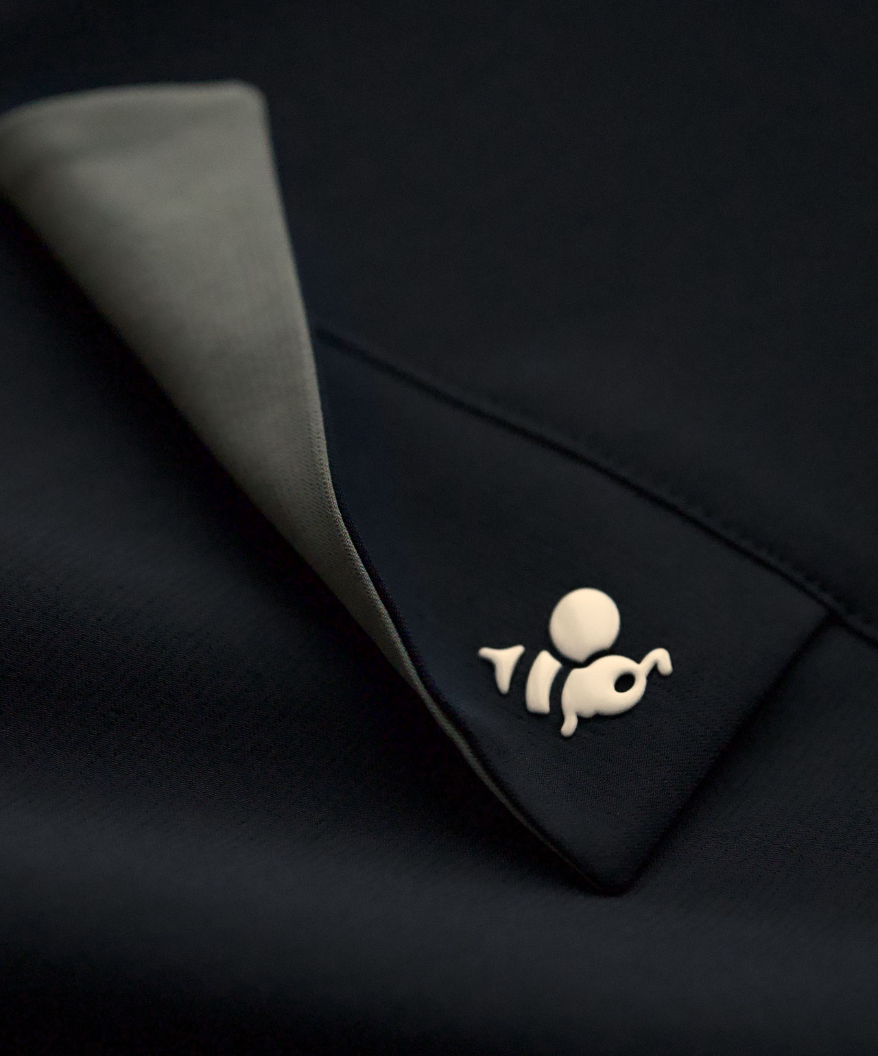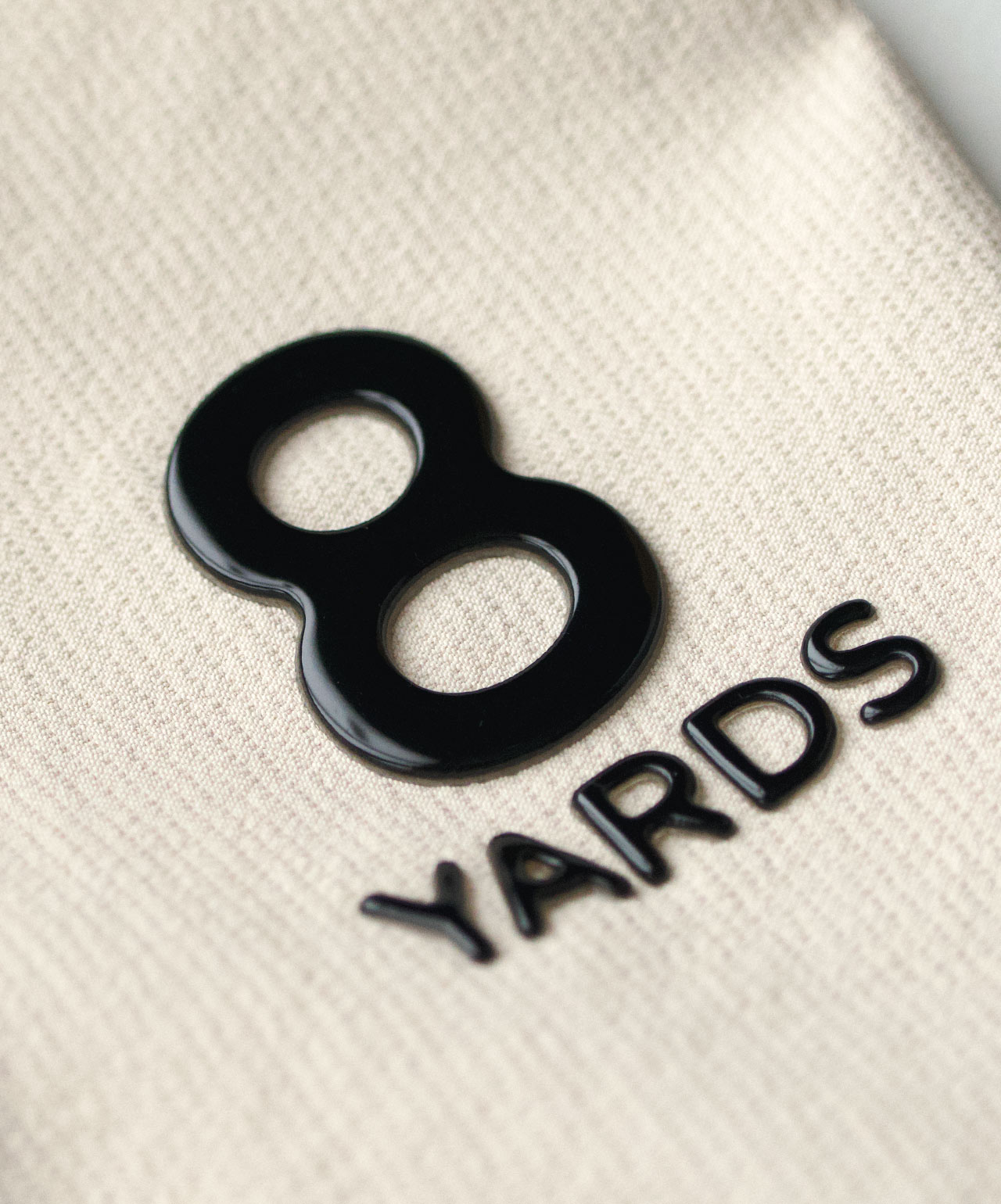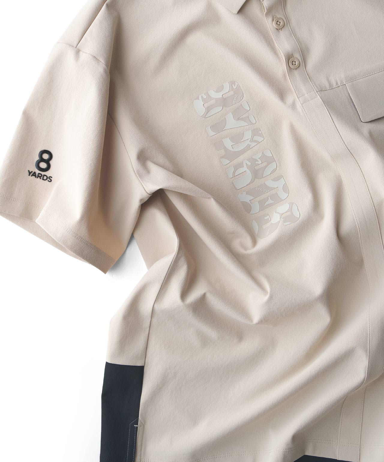 背面の裾にはインパクトのある配色を入れ、ヨーク部分には8YARDSの代名詞TAGLINEをシリコンで配置。胸元にはフラップポケットが付属し、フラップ部分にワンポイントでCaddieBee、右袖口にオフィシャルな8YARDSロゴをそれぞれ立体パーツで入れ"らしさ"を付加しました。