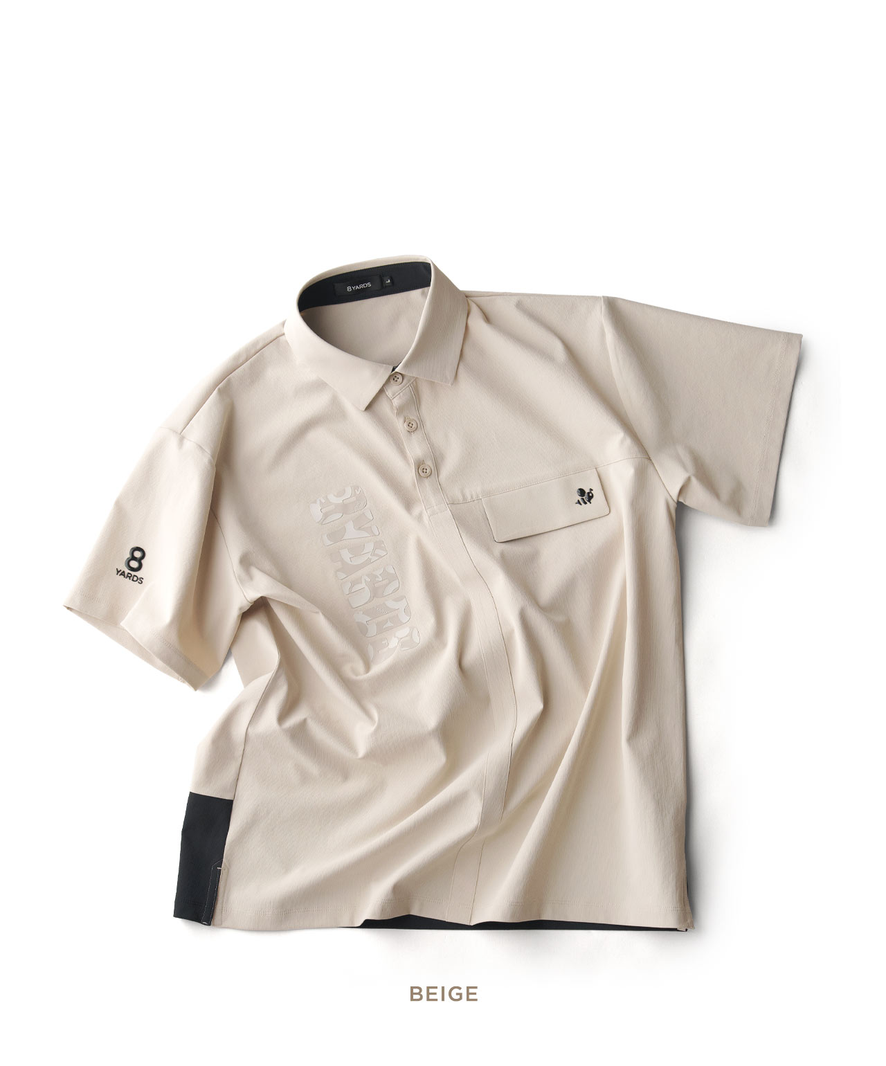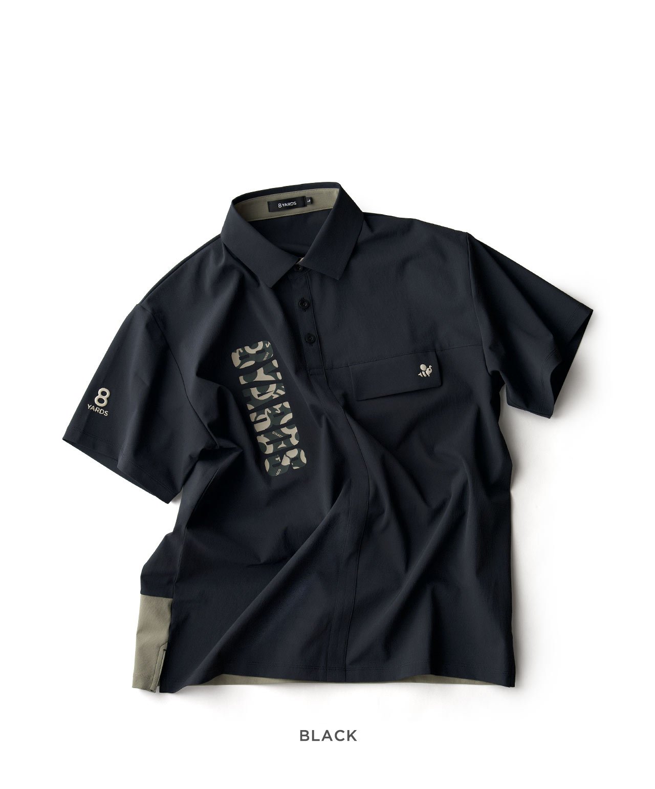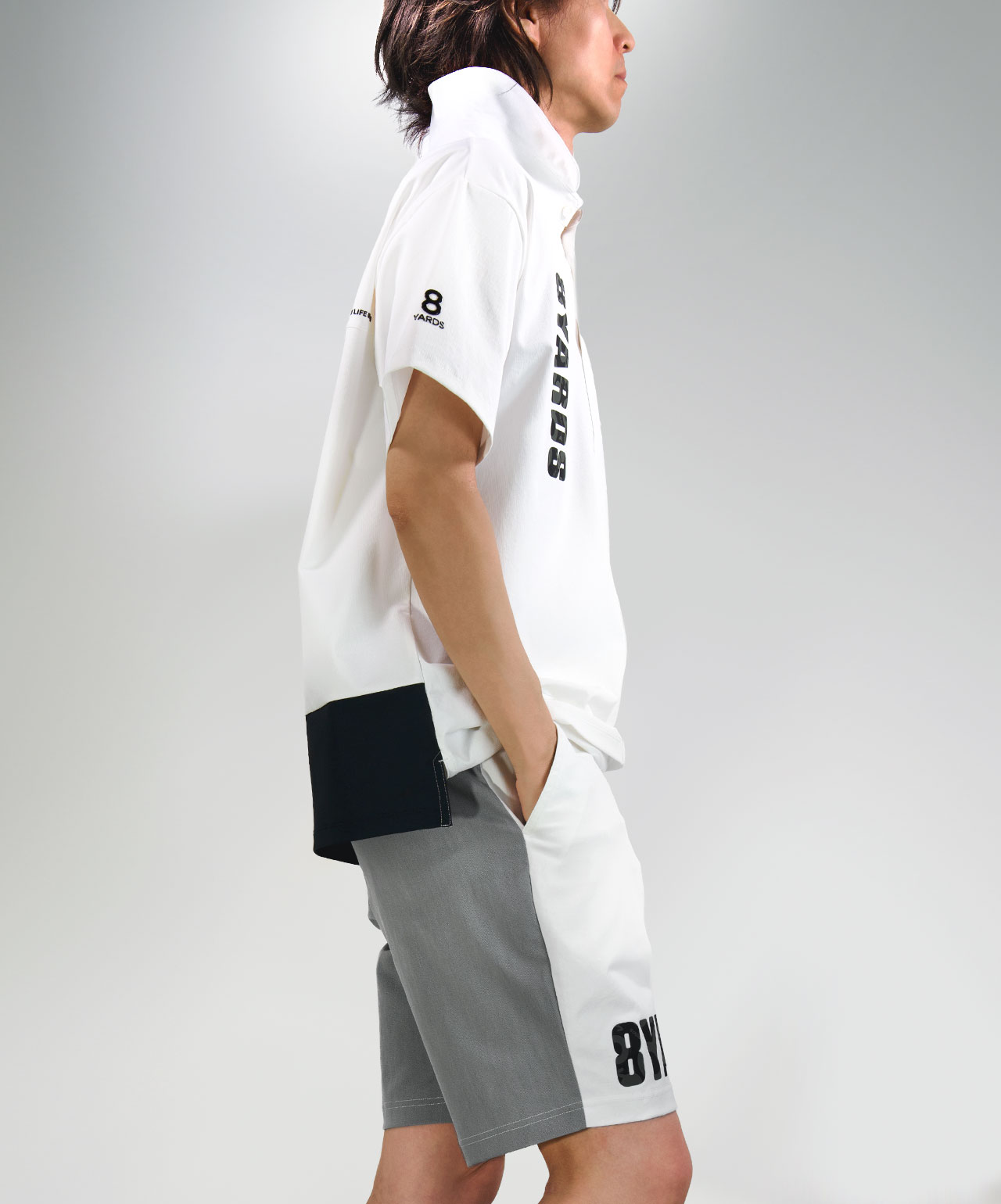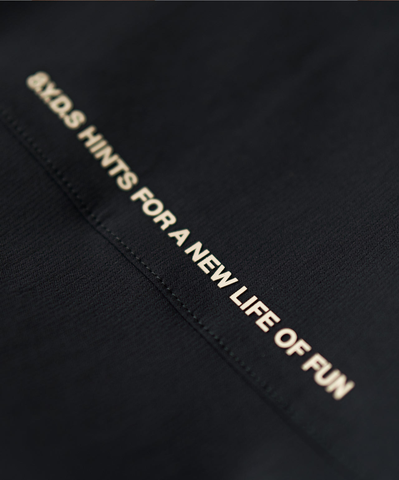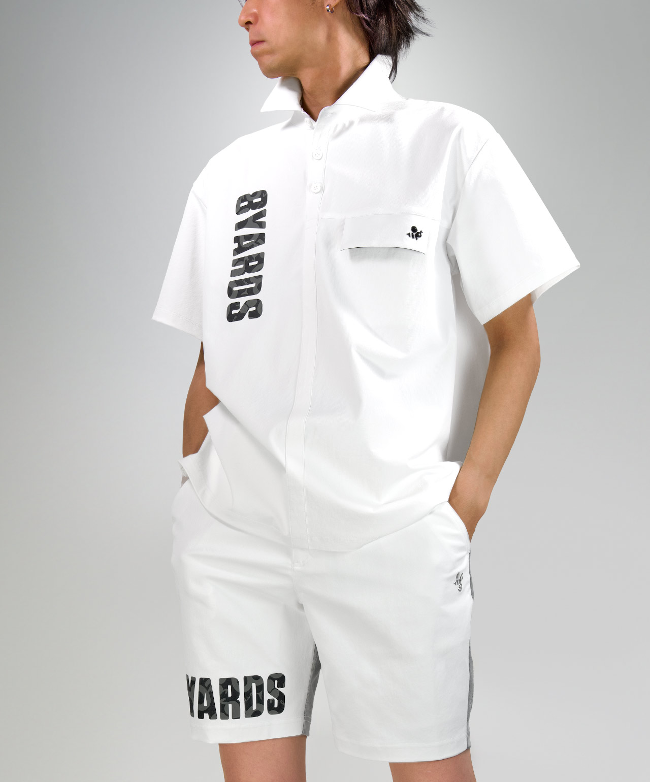背面の裾にはインパクトのある配色を入れ、ヨーク部分には8YARDSの代名詞TAGLINEをシリコンで配置。胸元にはフラップポケットが付属し、フラップ部分にワンポイントでCaddieBee、右袖口にオフィシャルな8YARDSロゴをそれぞれ立体パーツで入れ"らしさ"を付加しました。