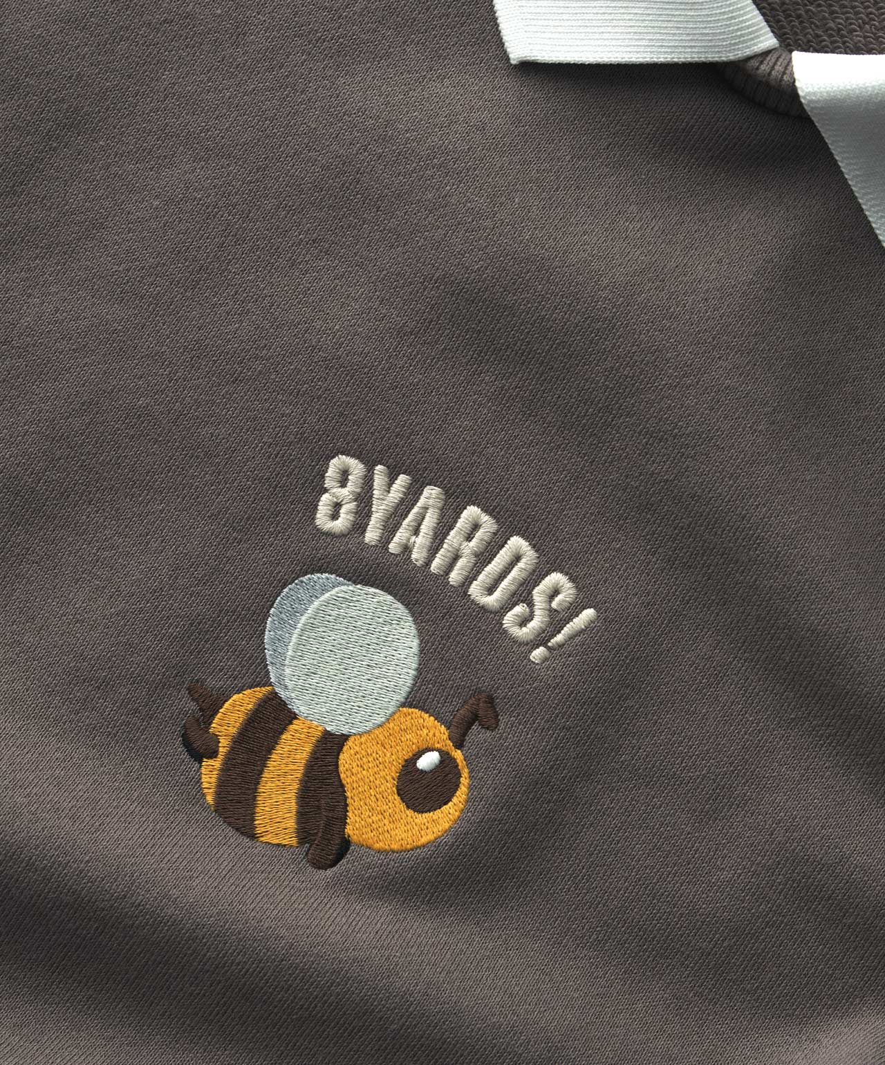 フロントの大きなCaddieBeeはボディーカラーに合わせて淡い色の刺繍で表現。上部の刺繍「8YARDS!」と新しい組み合わせで、ポップに落とし込みました。