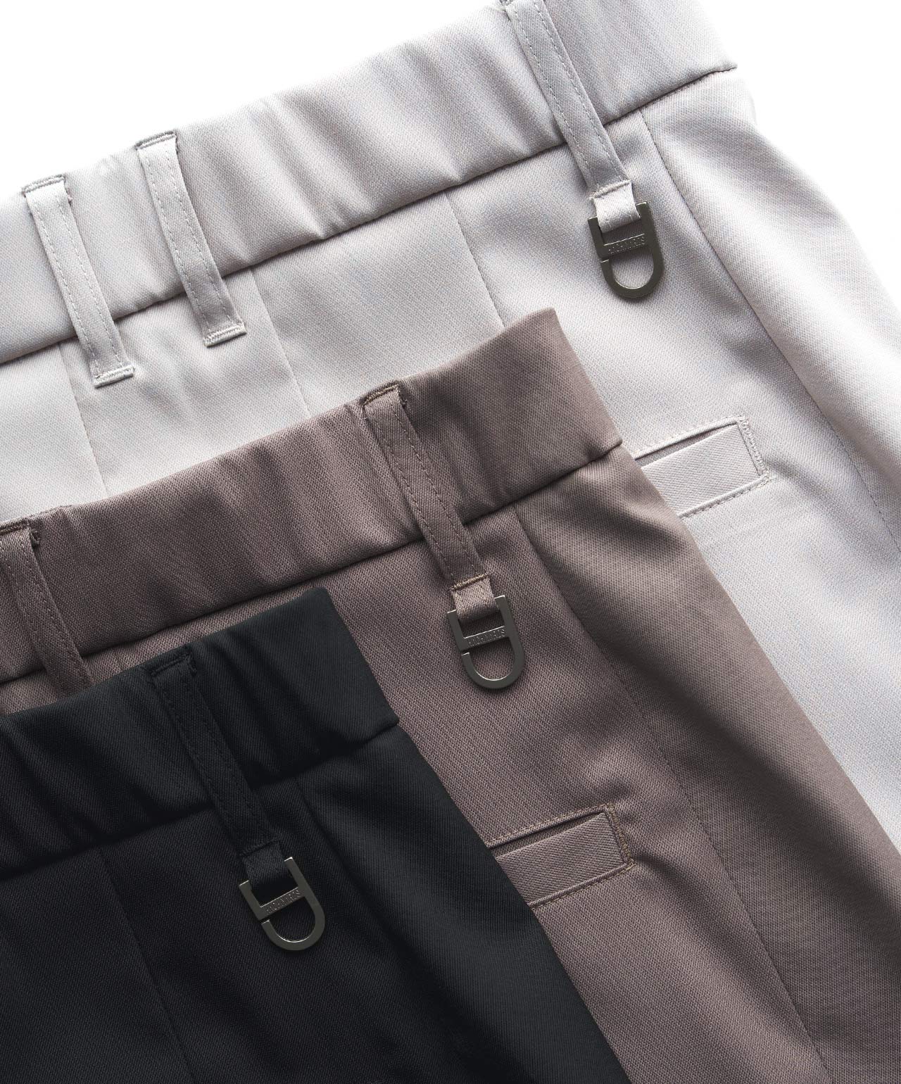 綿とポリエステルを交互に配列した複合繊維素材。風合いのあるコットンの良さがありながらポリエステルの機能性と扱いやすさを併せ持つ機能素材。ストレッチ性、防シワ性能、弱撥水機能を備えています。フィット感が高まるウエストゴム仕様。ベルトループ・オリジナルのDカンが付属します。