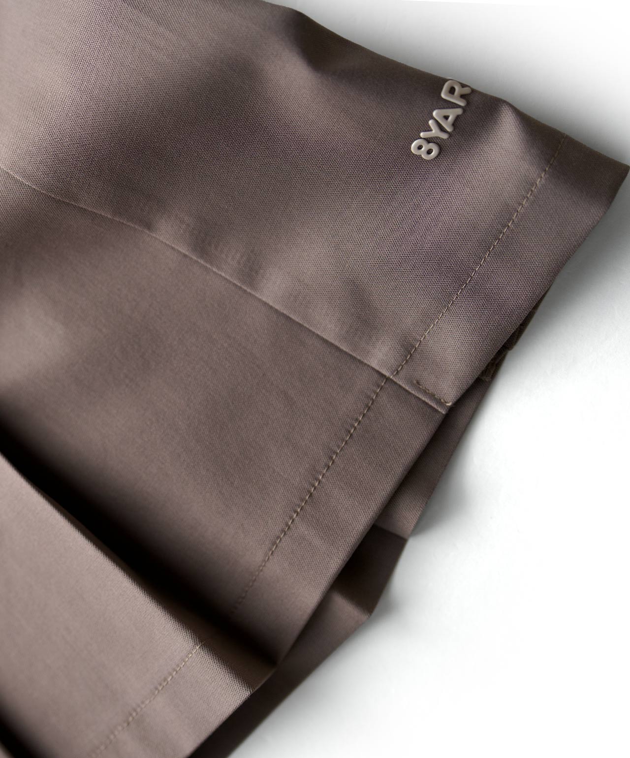 上部をステッチで固定したプリーツは開きすぎず、大人のセットアップに最適。