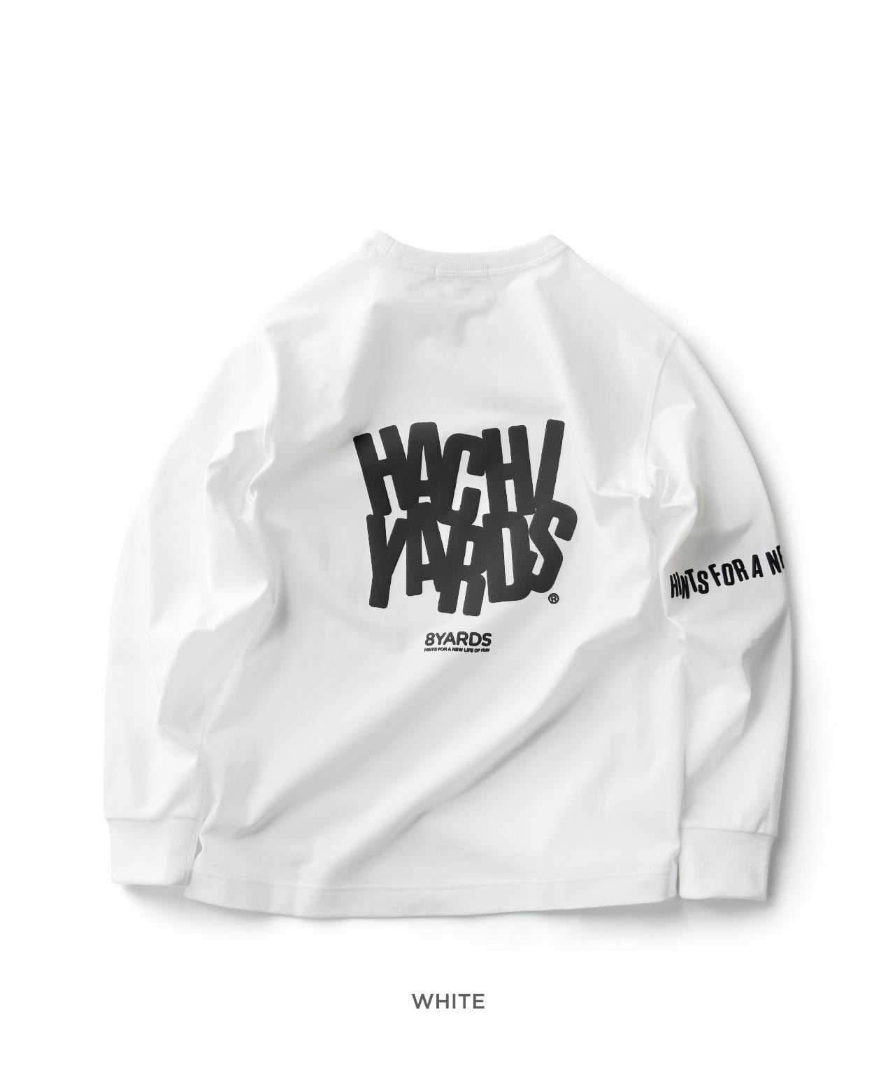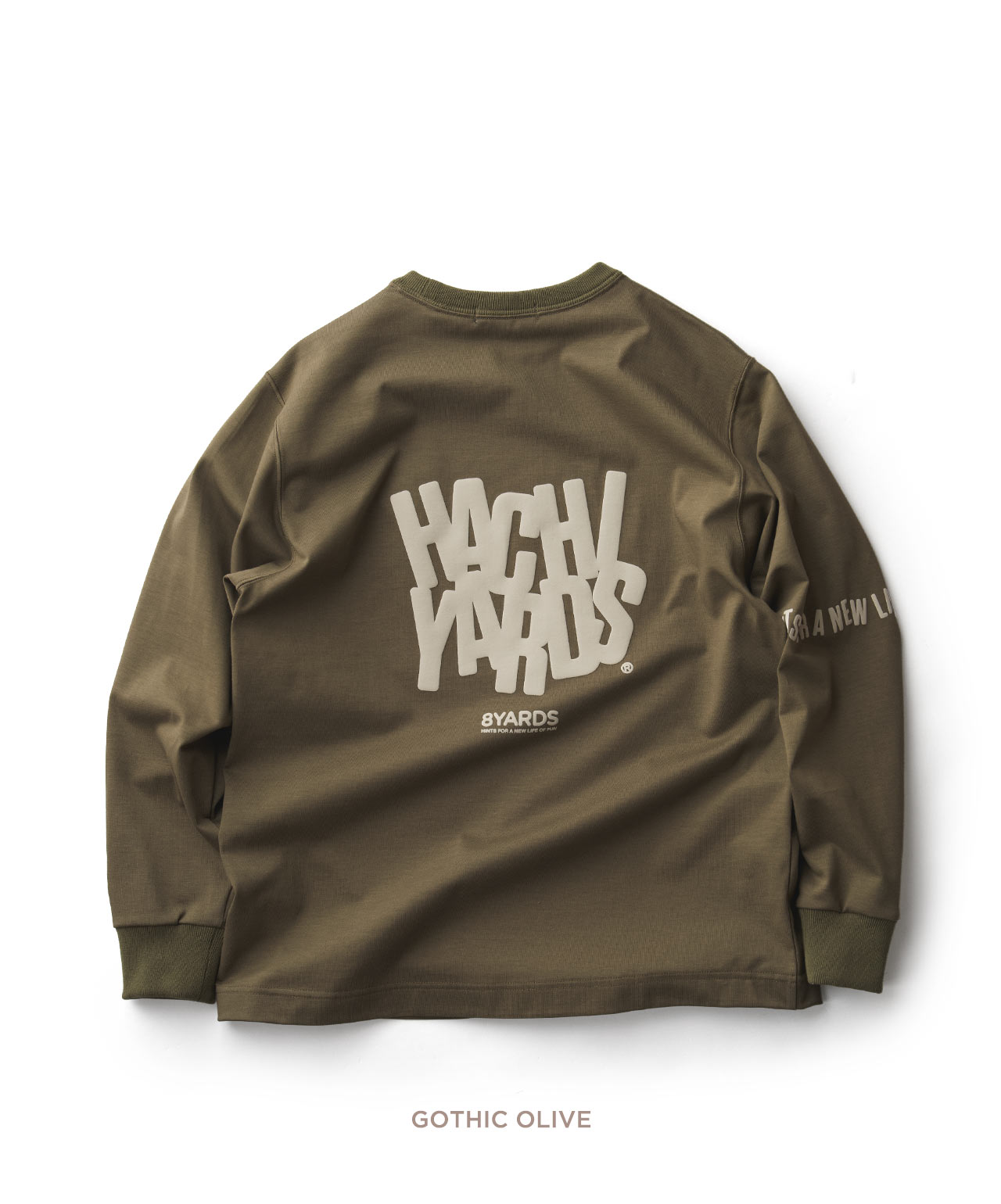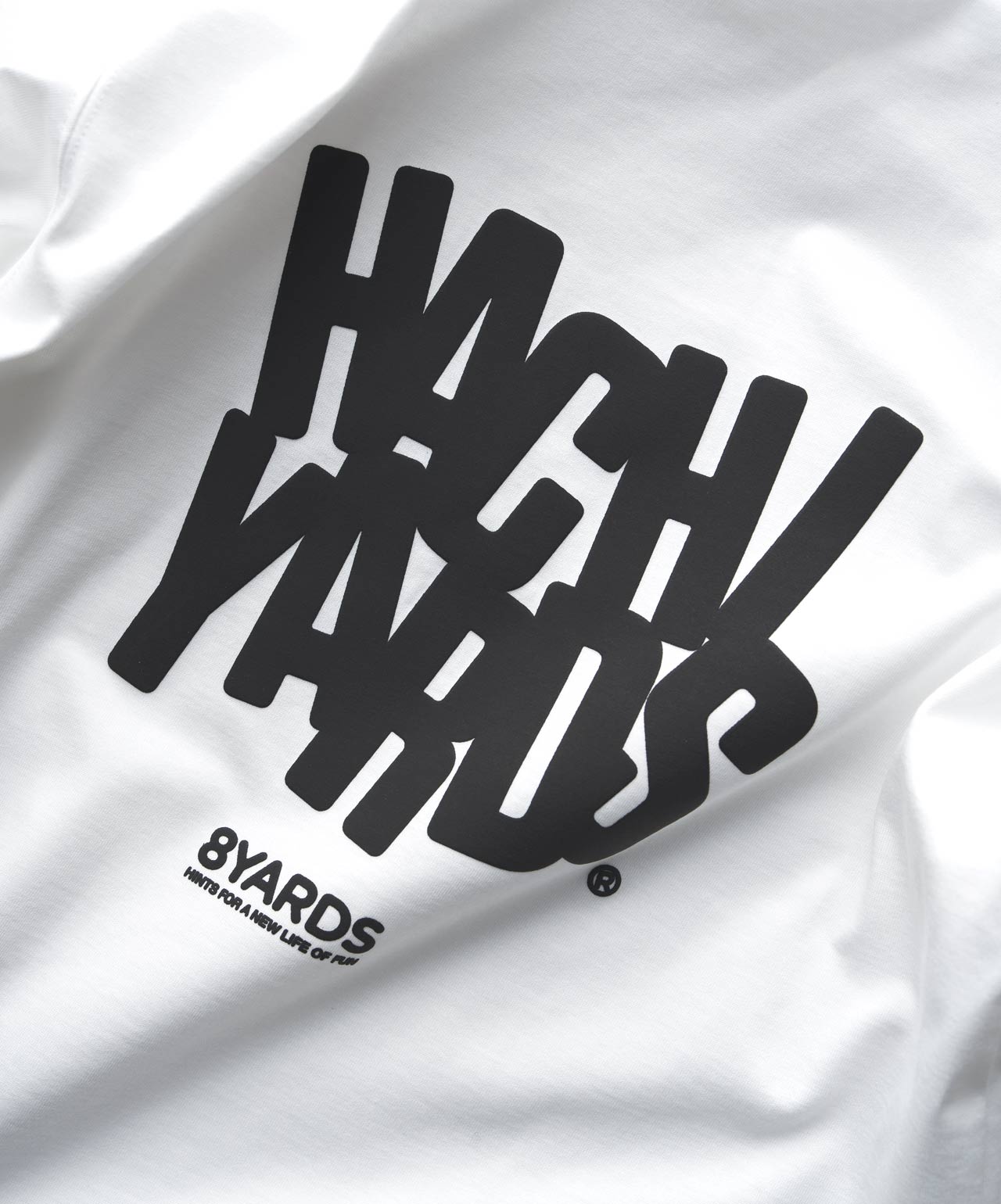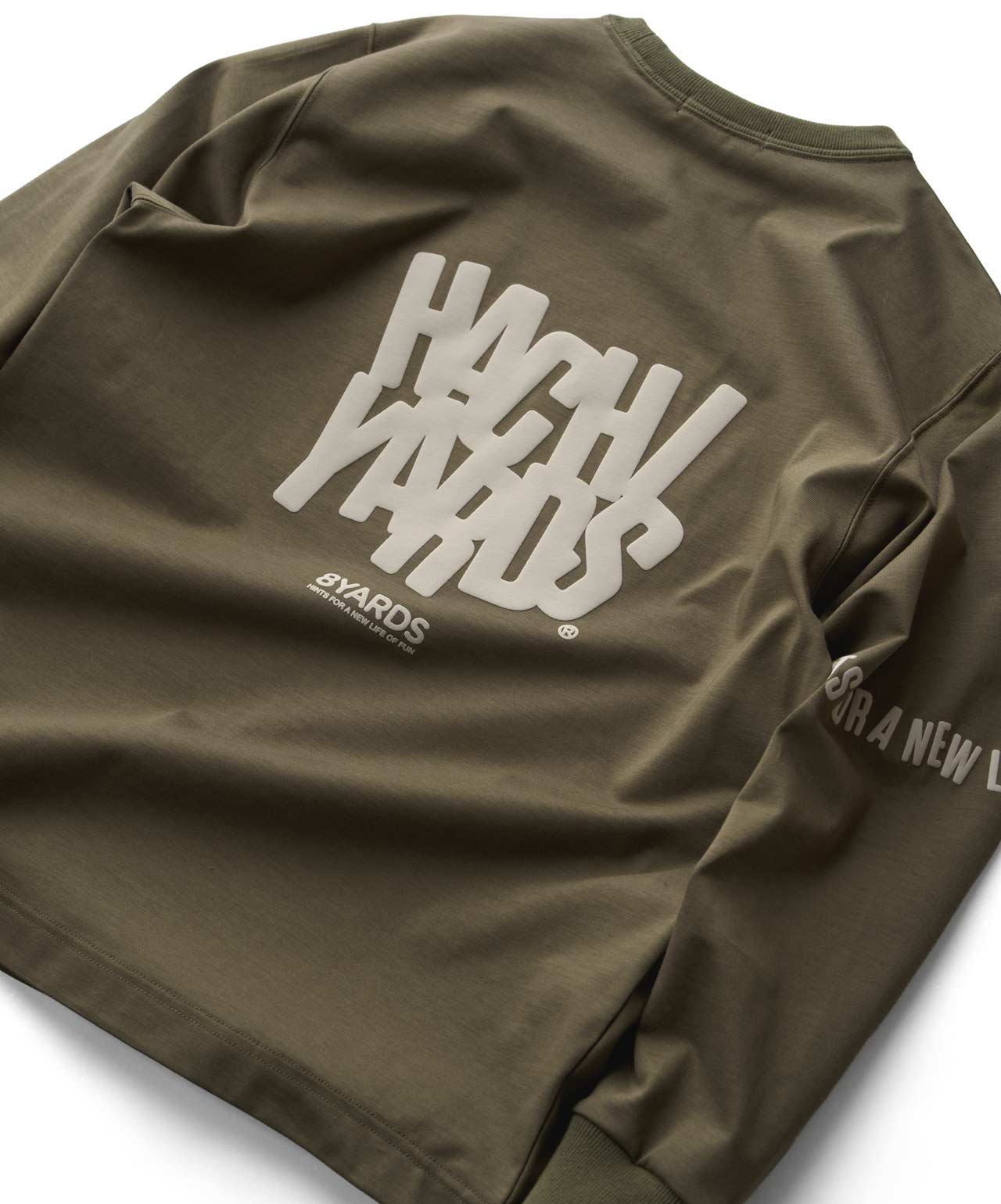 ダイナミックなバックデザインは、8TLONG専用の”踊るHACHIYARDSロゴ”を採用し、右袖のTAGLINEも含め、とことん”踊るロゴ”に磨きをかけました。対してフロントは8YARDSのワンポイントでシンプルにオン。全て膨らみ感のある発泡プリントで、ロゴとマッチした加工で落とし込みました。