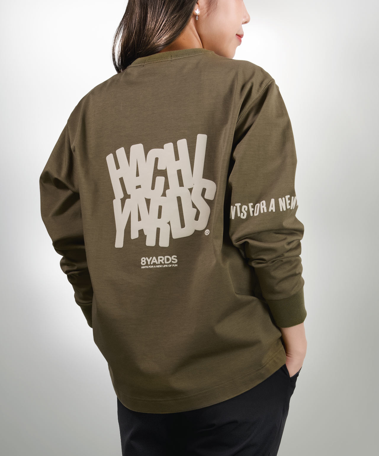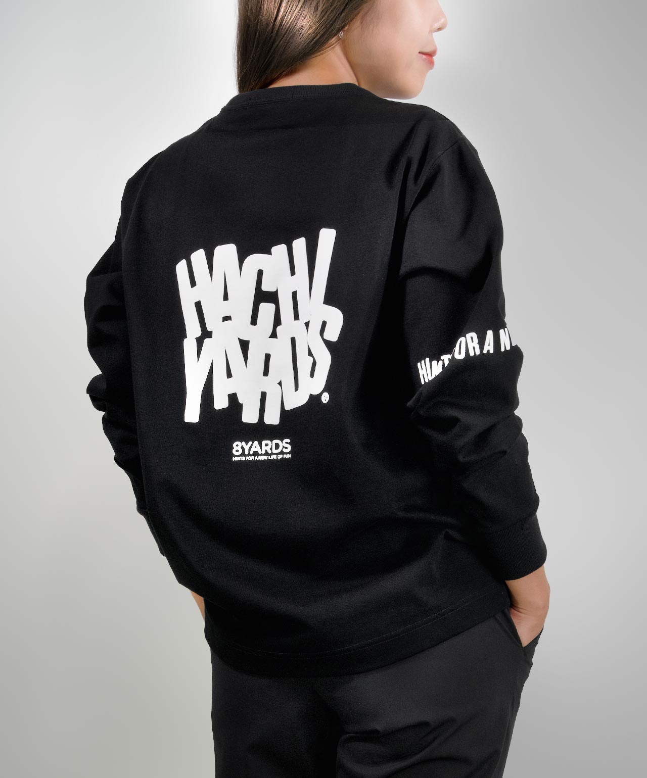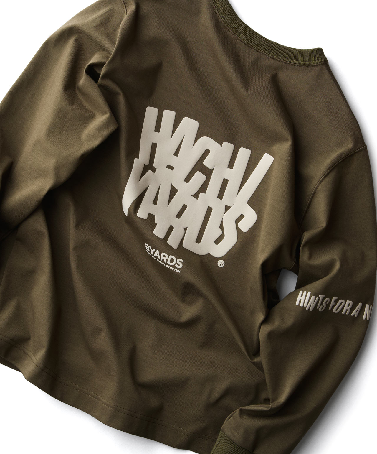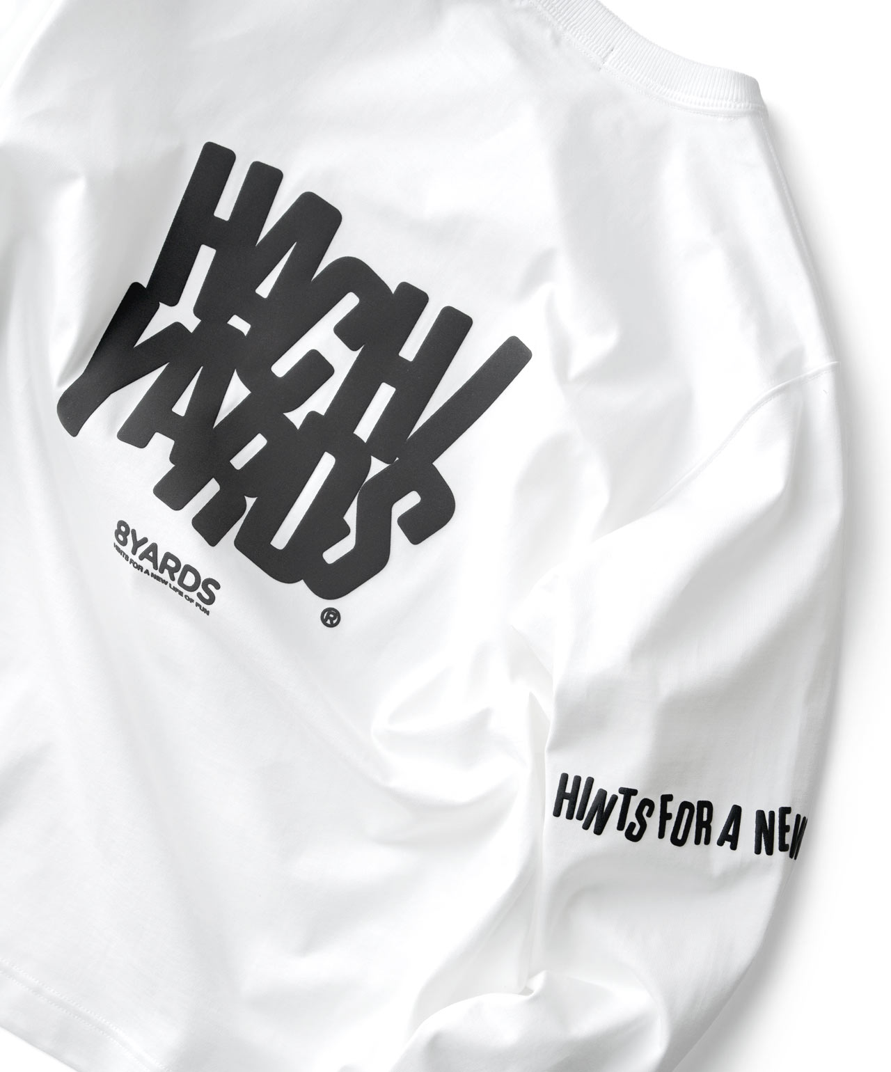 ダイナミックなバックデザインは、8TLONG専用の”踊るHACHIYARDSロゴ”を採用し、右袖のTAGLINEも含め、とことん”踊るロゴ”に磨きをかけました。対してフロントは8YARDSのワンポイントでシンプルにオン。全て膨らみ感のある発泡プリントで、ロゴとマッチした加工で落とし込みました。