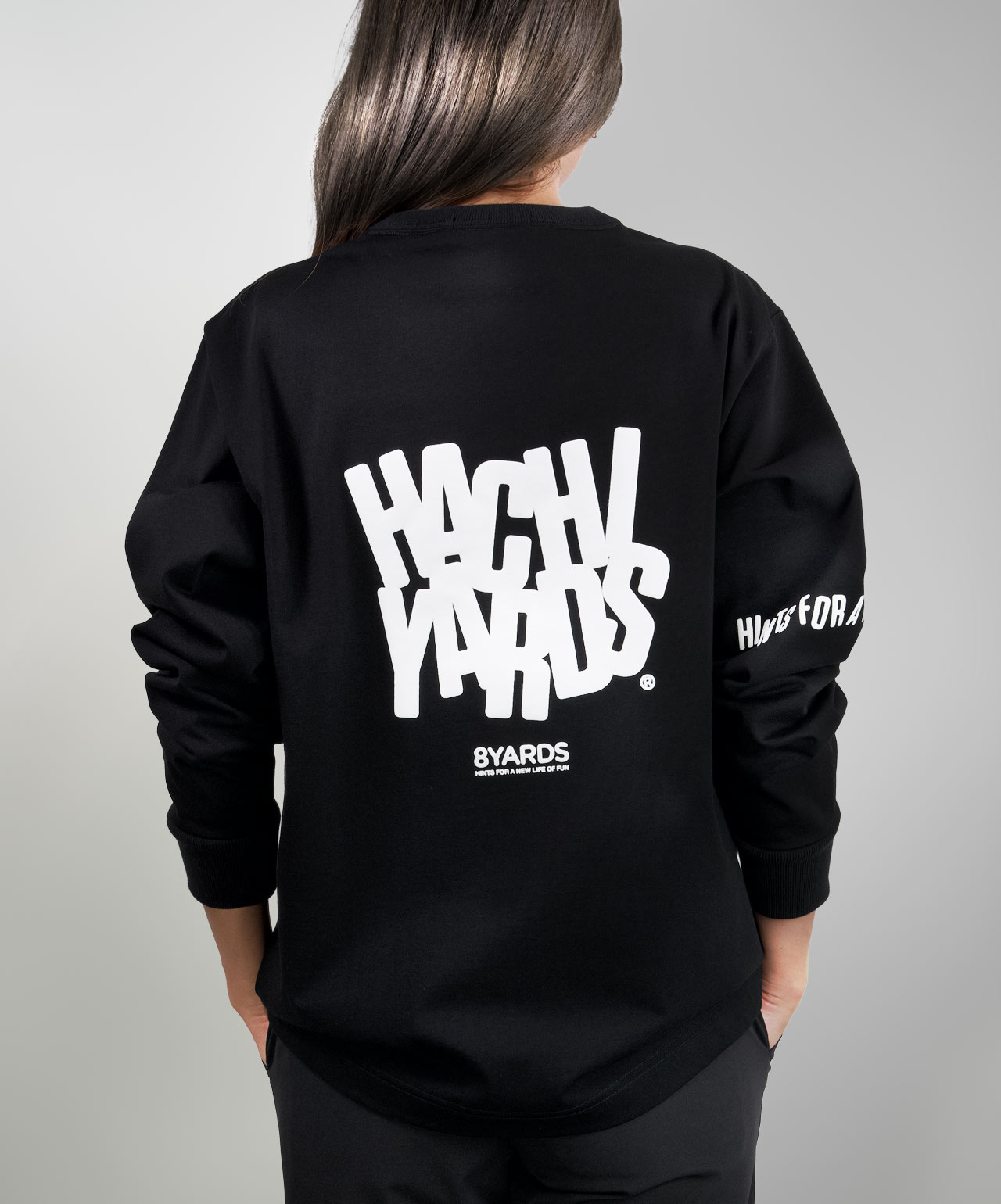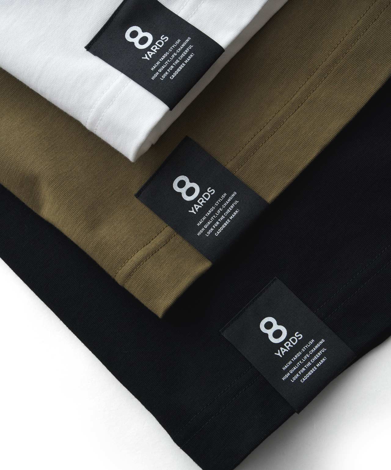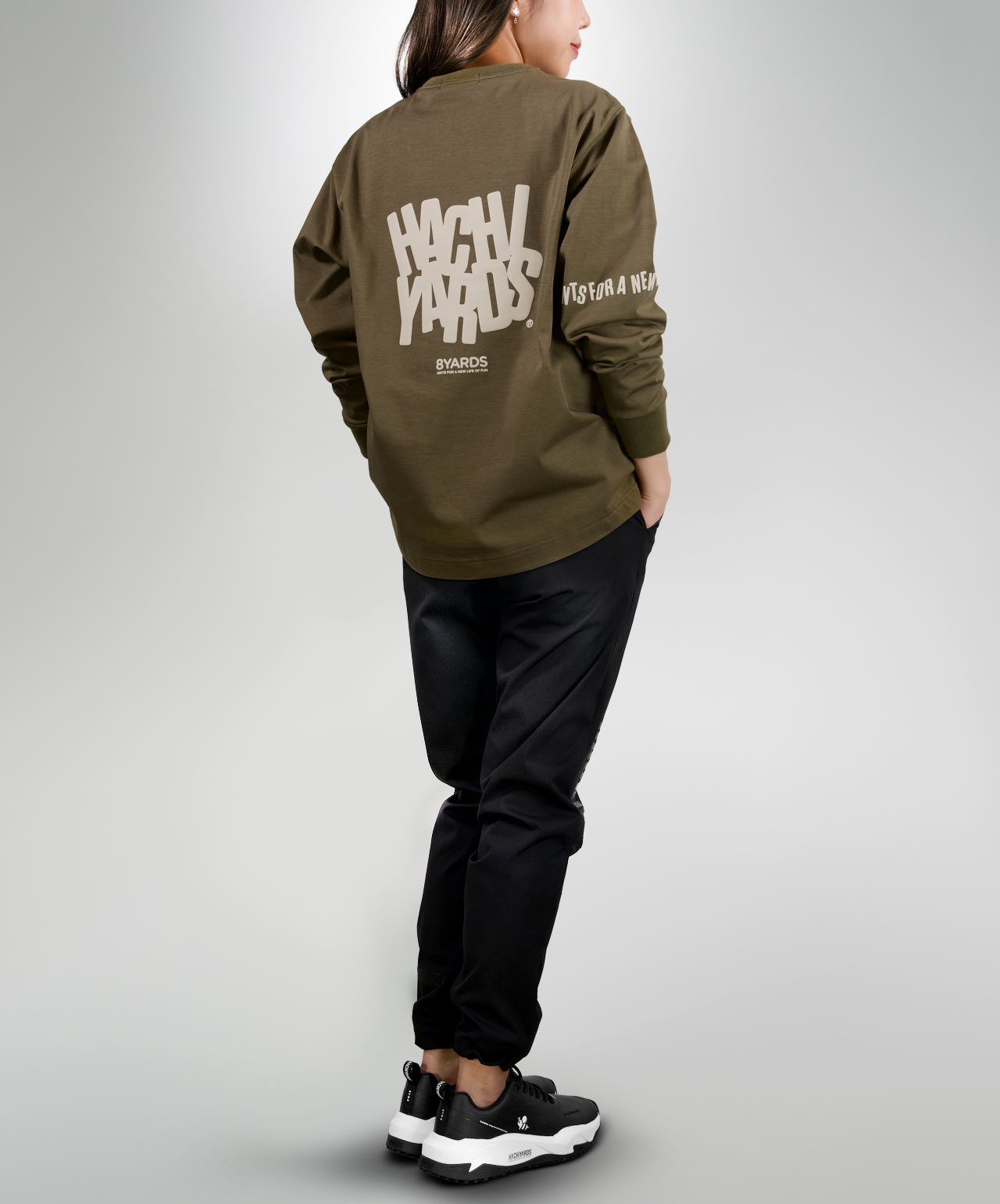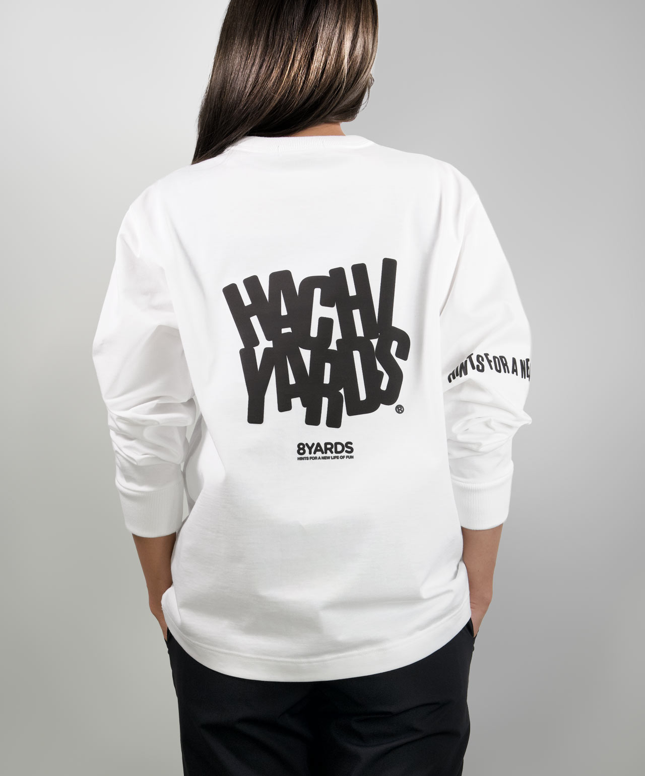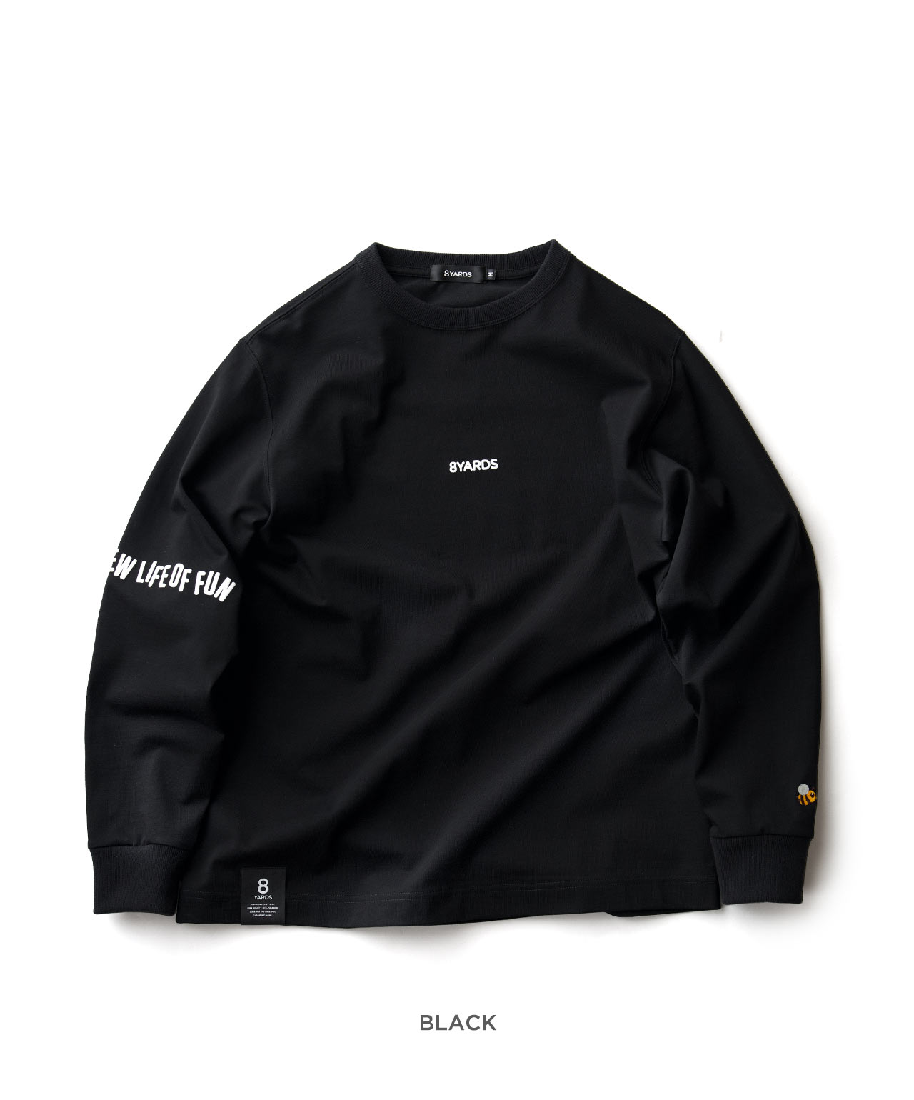 ダイナミックなバックデザインは、8TLONG専用の”踊るHACHIYARDSロゴ”を採用し、右袖のTAGLINEも含め、とことん”踊るロゴ”に磨きをかけました。対してフロントは8YARDSのワンポイントでシンプルにオン。全て膨らみ感のある発泡プリントで、ロゴとマッチした加工で落とし込みました。