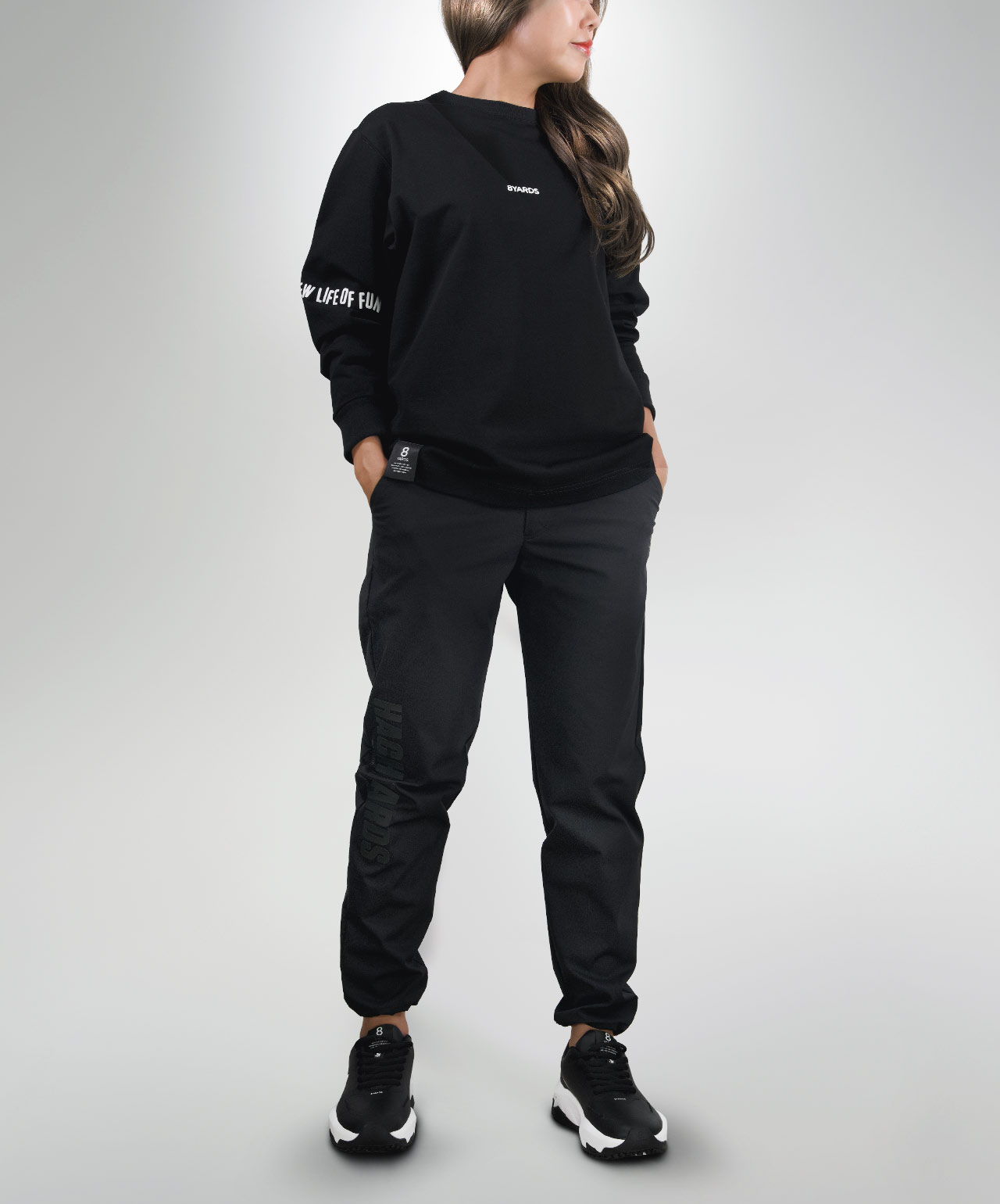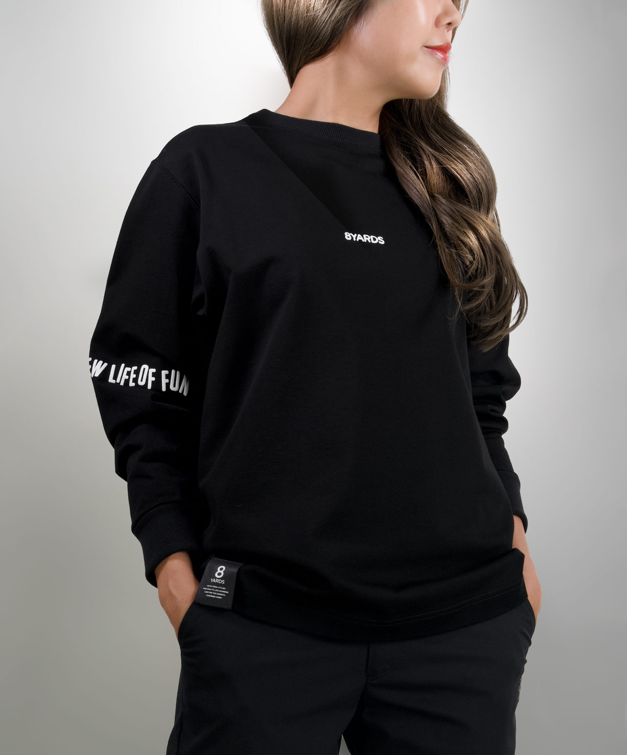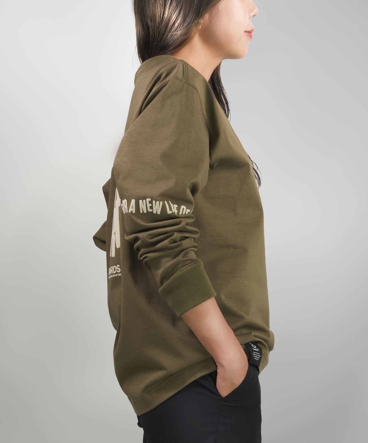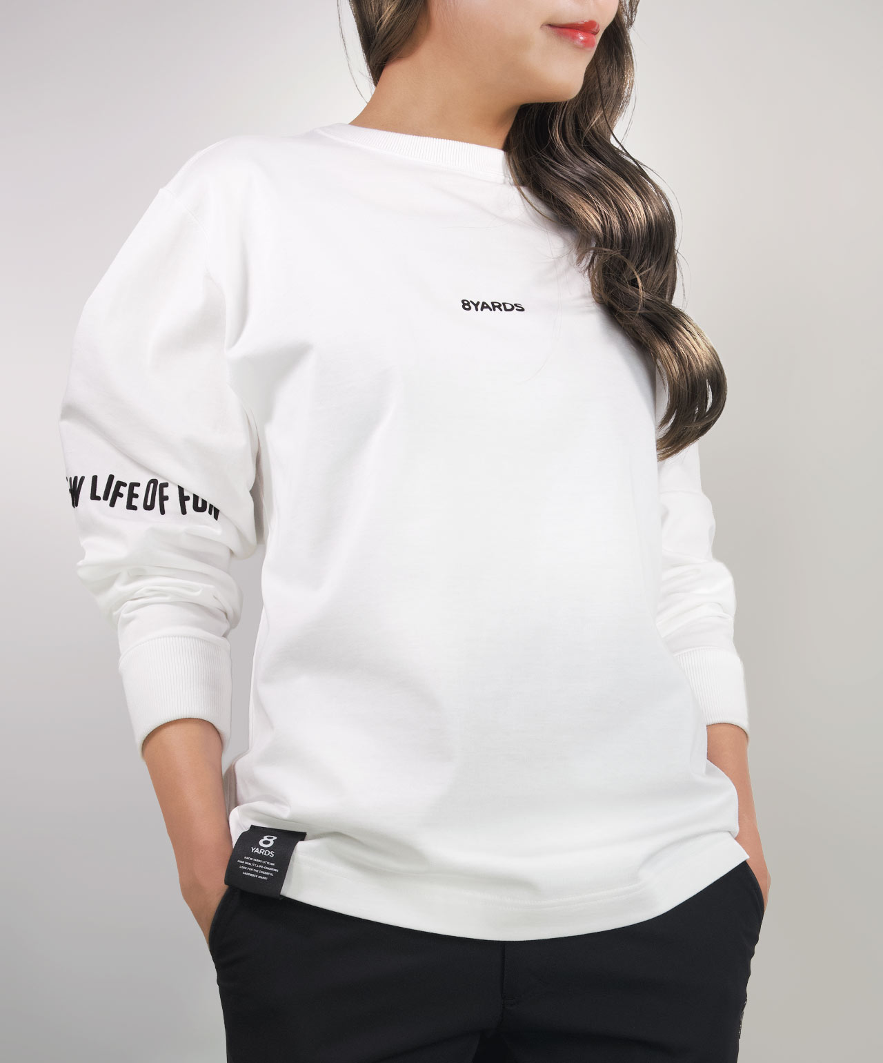 ダイナミックなバックデザインは、8TLONG専用の”踊るHACHIYARDSロゴ”を採用し、右袖のTAGLINEも含め、とことん”踊るロゴ”に磨きをかけました。対してフロントは8YARDSのワンポイントでシンプルにオン。全て膨らみ感のある発泡プリントで、ロゴとマッチした加工で落とし込みました。