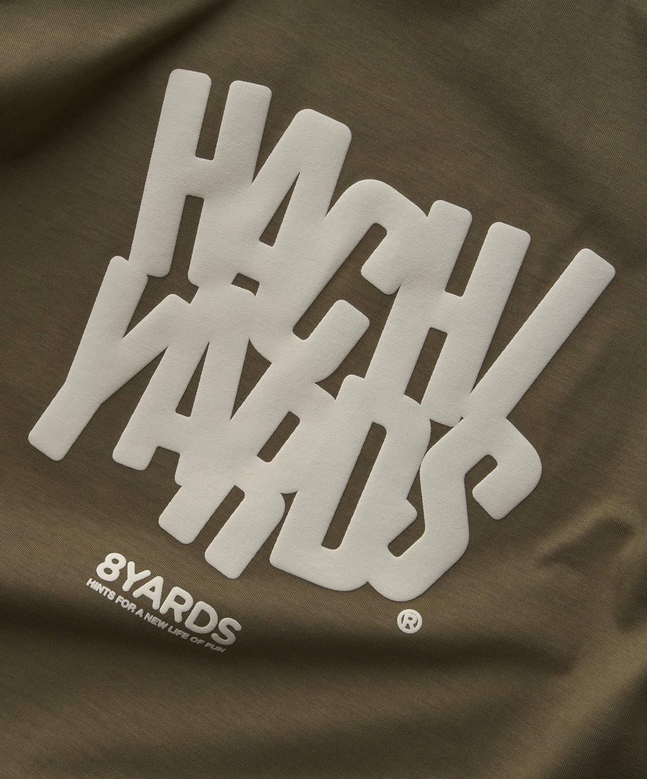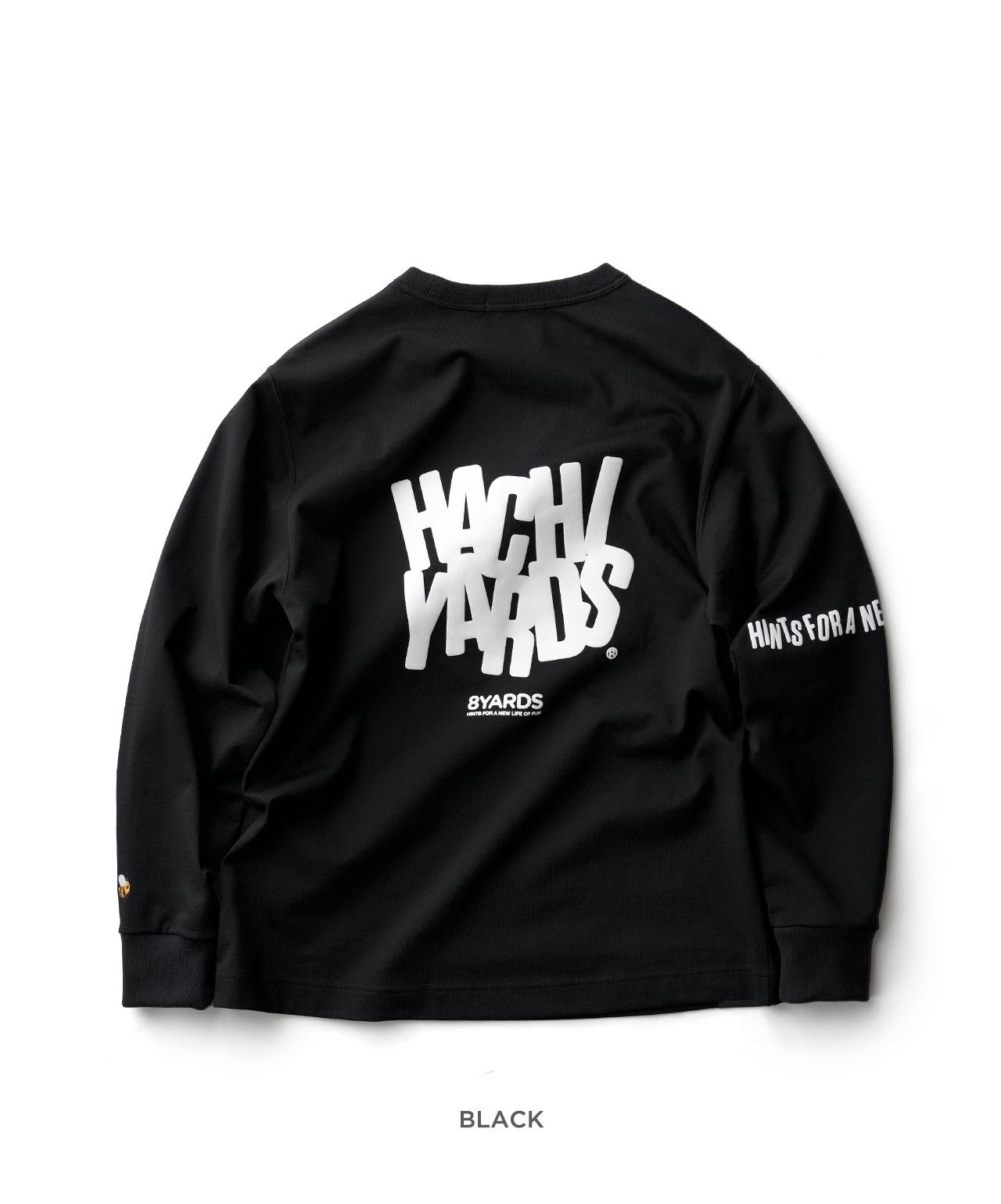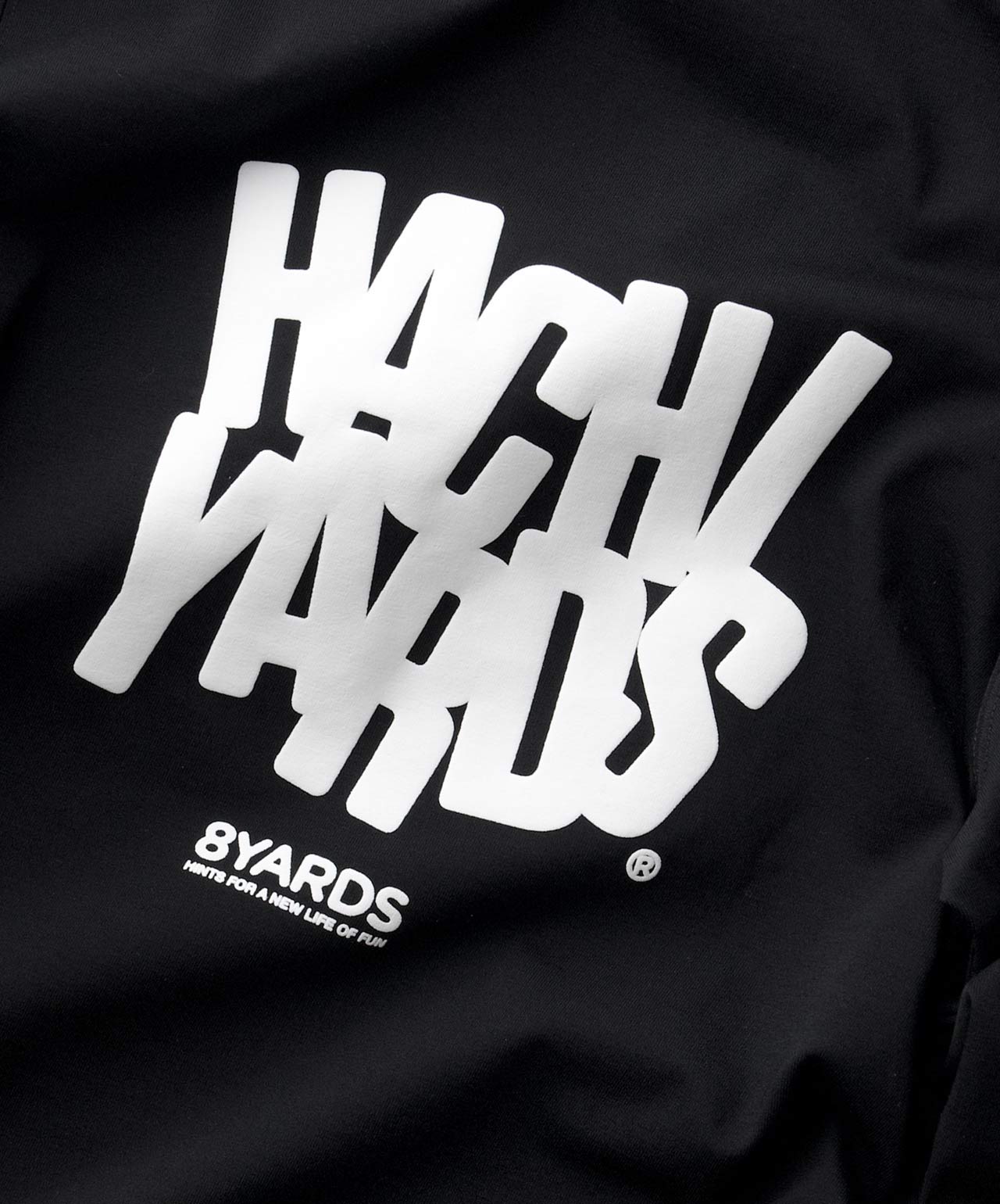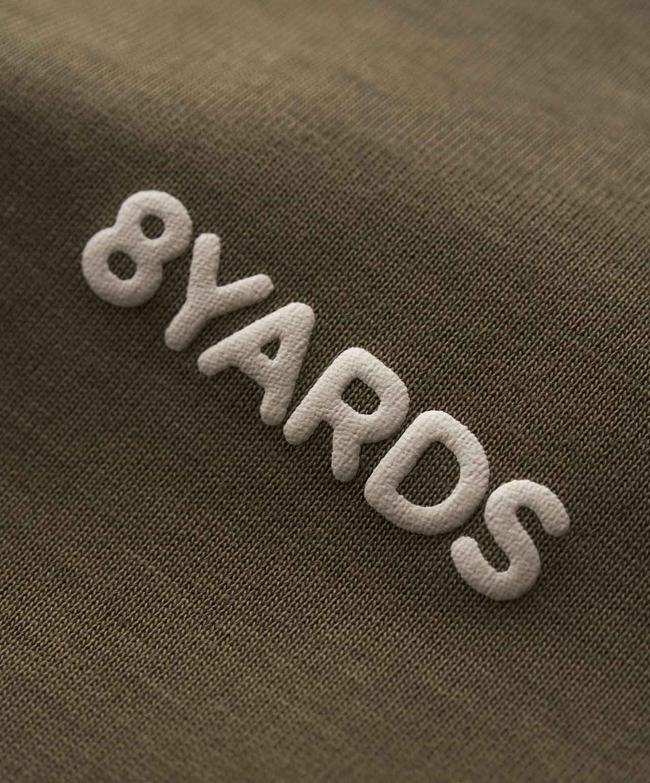 ダイナミックなバックデザインは、8TLONG専用の”踊るHACHIYARDSロゴ”を採用し、右袖のTAGLINEも含め、とことん”踊るロゴ”に磨きをかけました。対してフロントは8YARDSのワンポイントでシンプルにオン。全て膨らみ感のある発泡プリントで、ロゴとマッチした加工で落とし込みました。