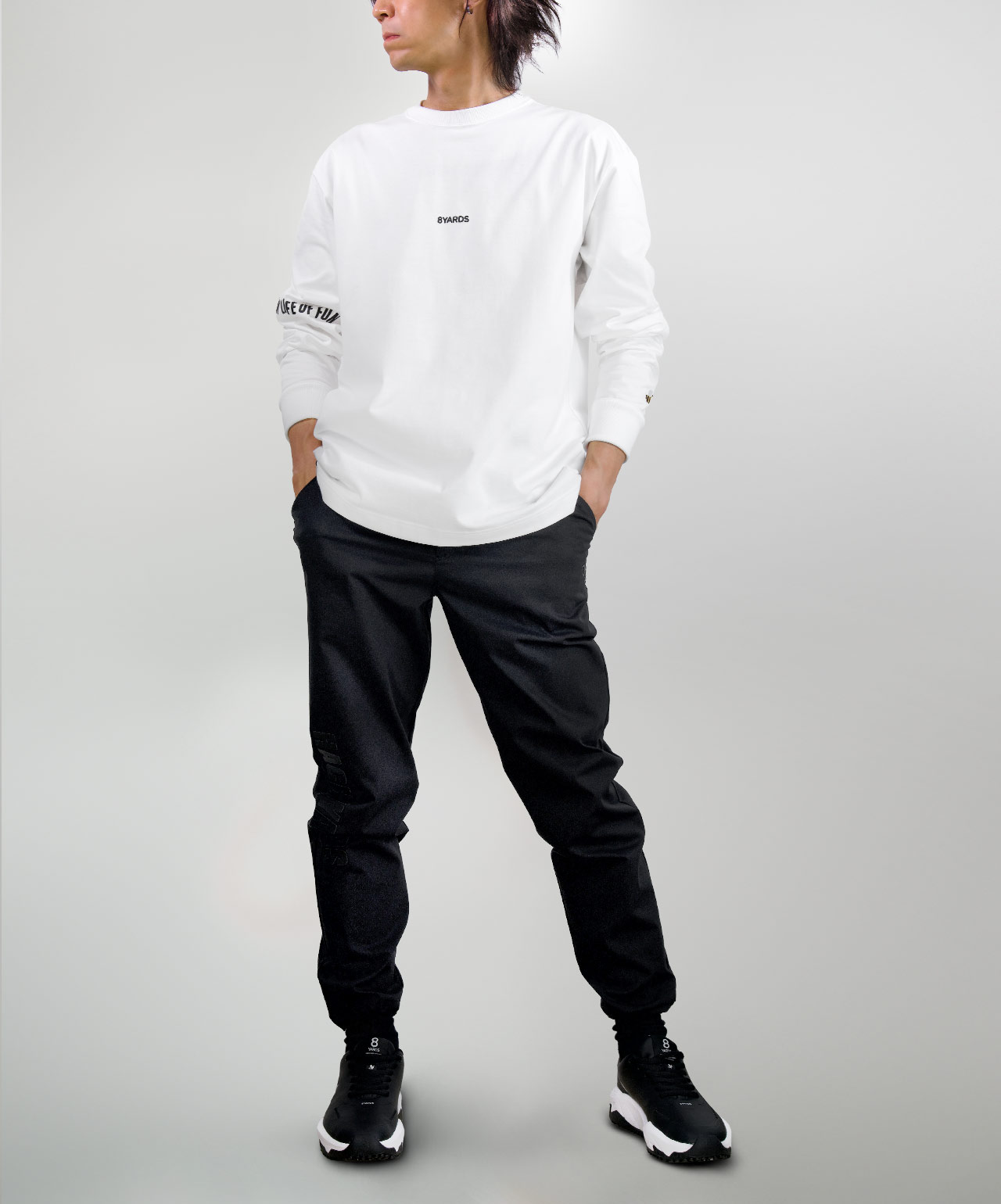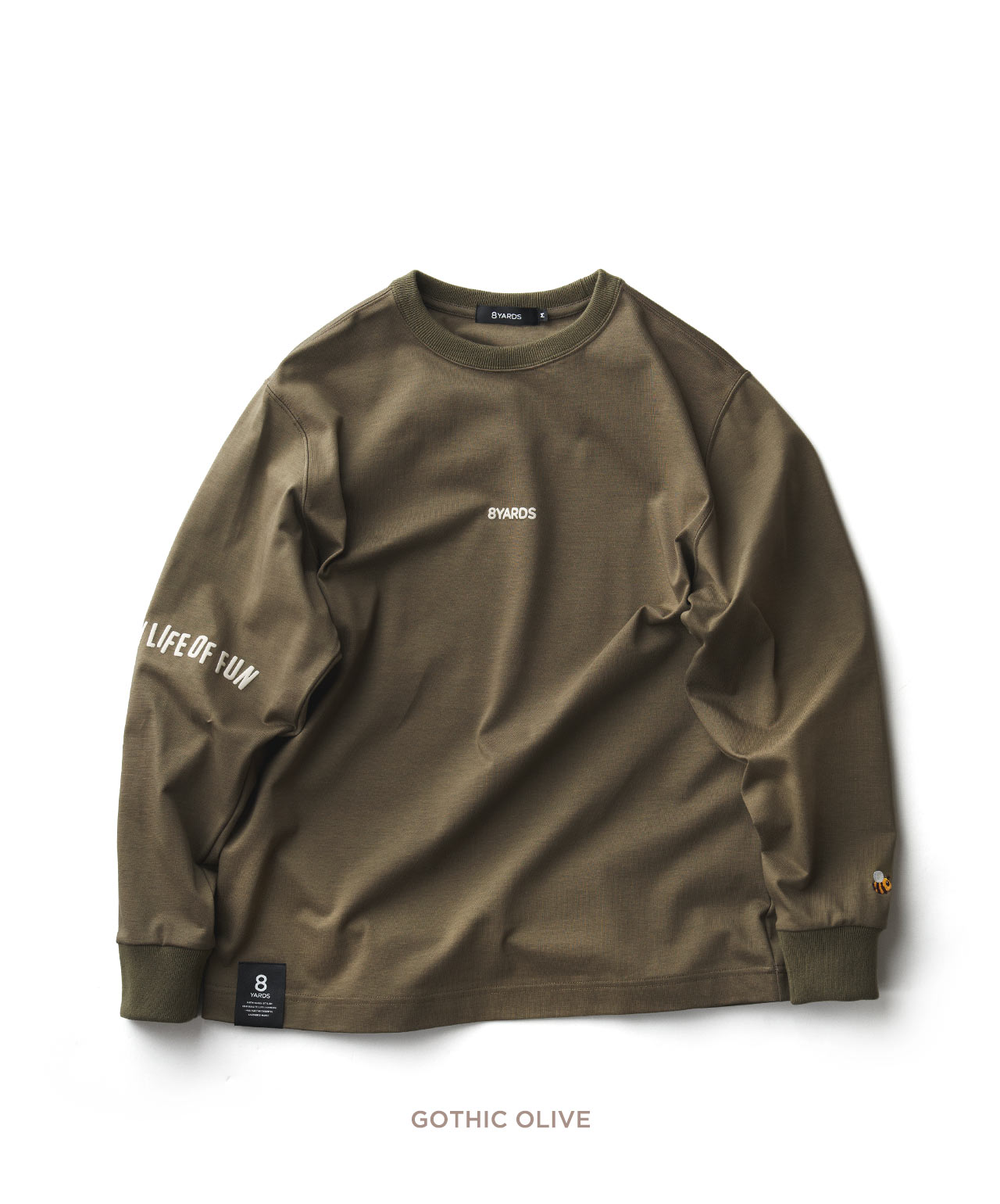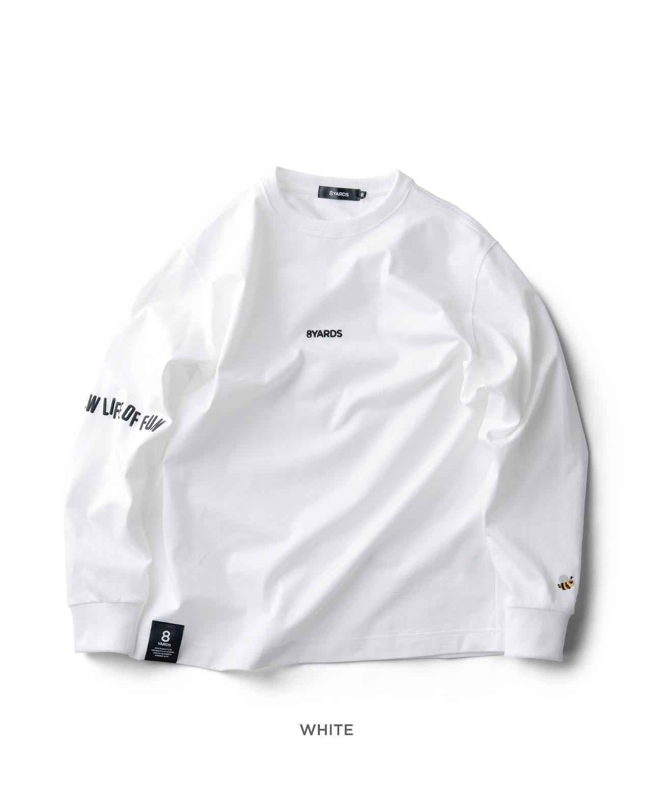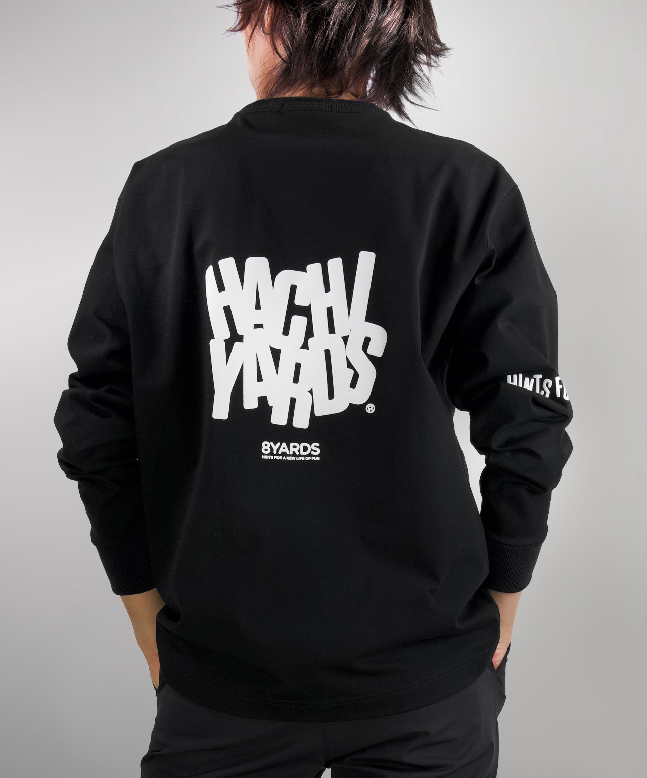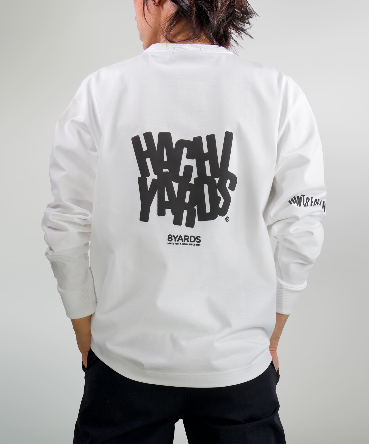 ダイナミックなバックデザインは、8TLONG専用の”踊るHACHIYARDSロゴ”を採用し、右袖のTAGLINEも含め、とことん”踊るロゴ”に磨きをかけました。対してフロントは8YARDSのワンポイントでシンプルにオン。全て膨らみ感のある発泡プリントで、ロゴとマッチした加工で落とし込みました。