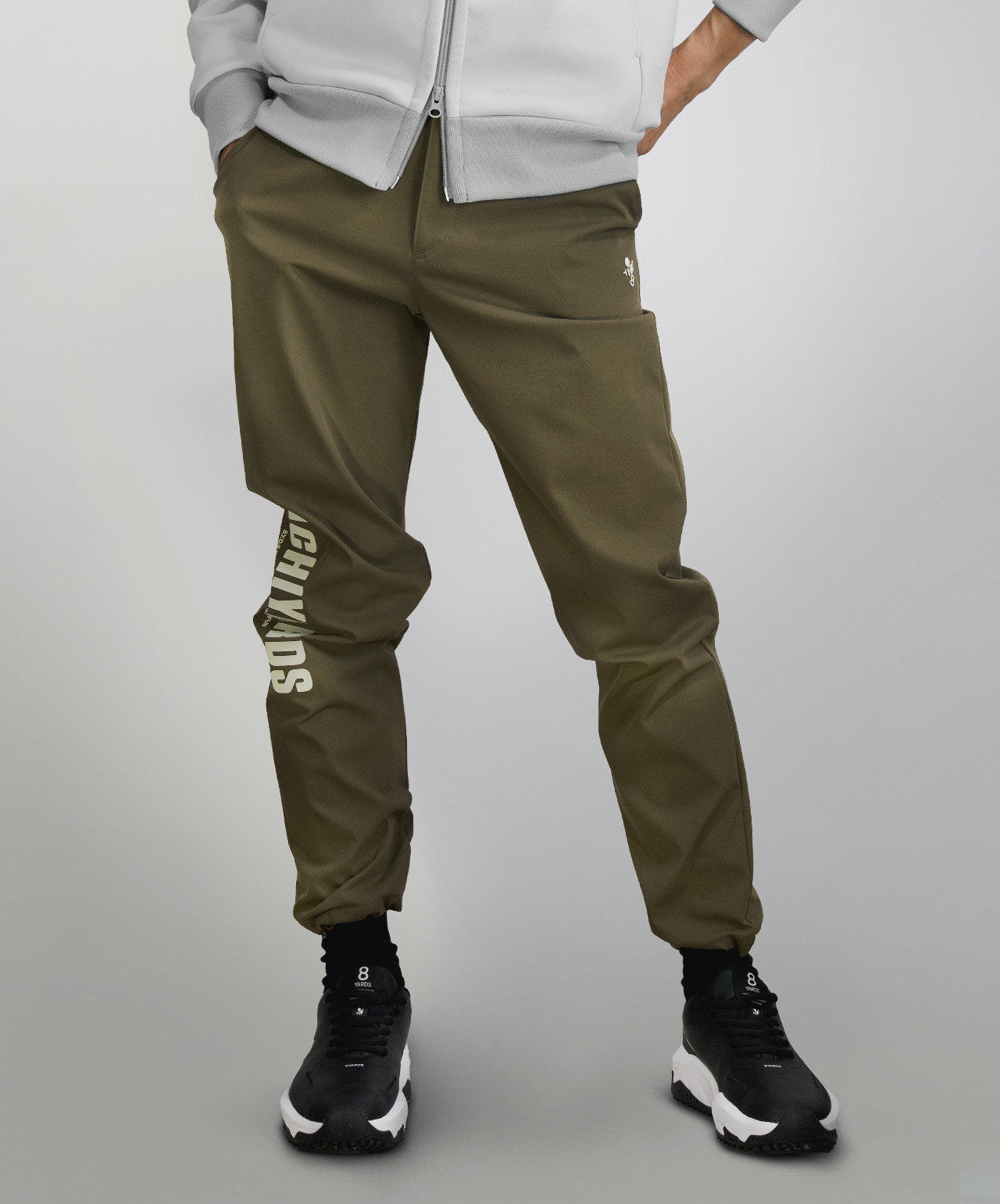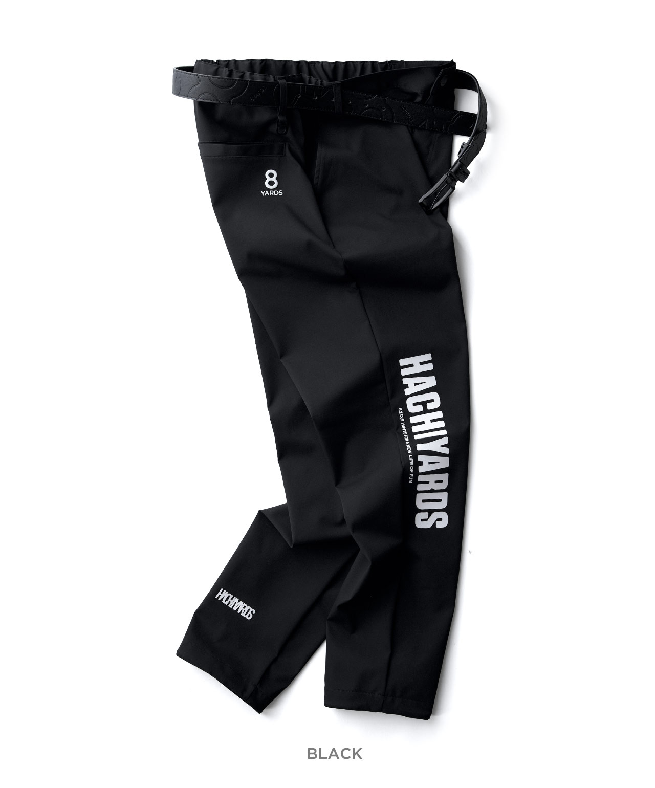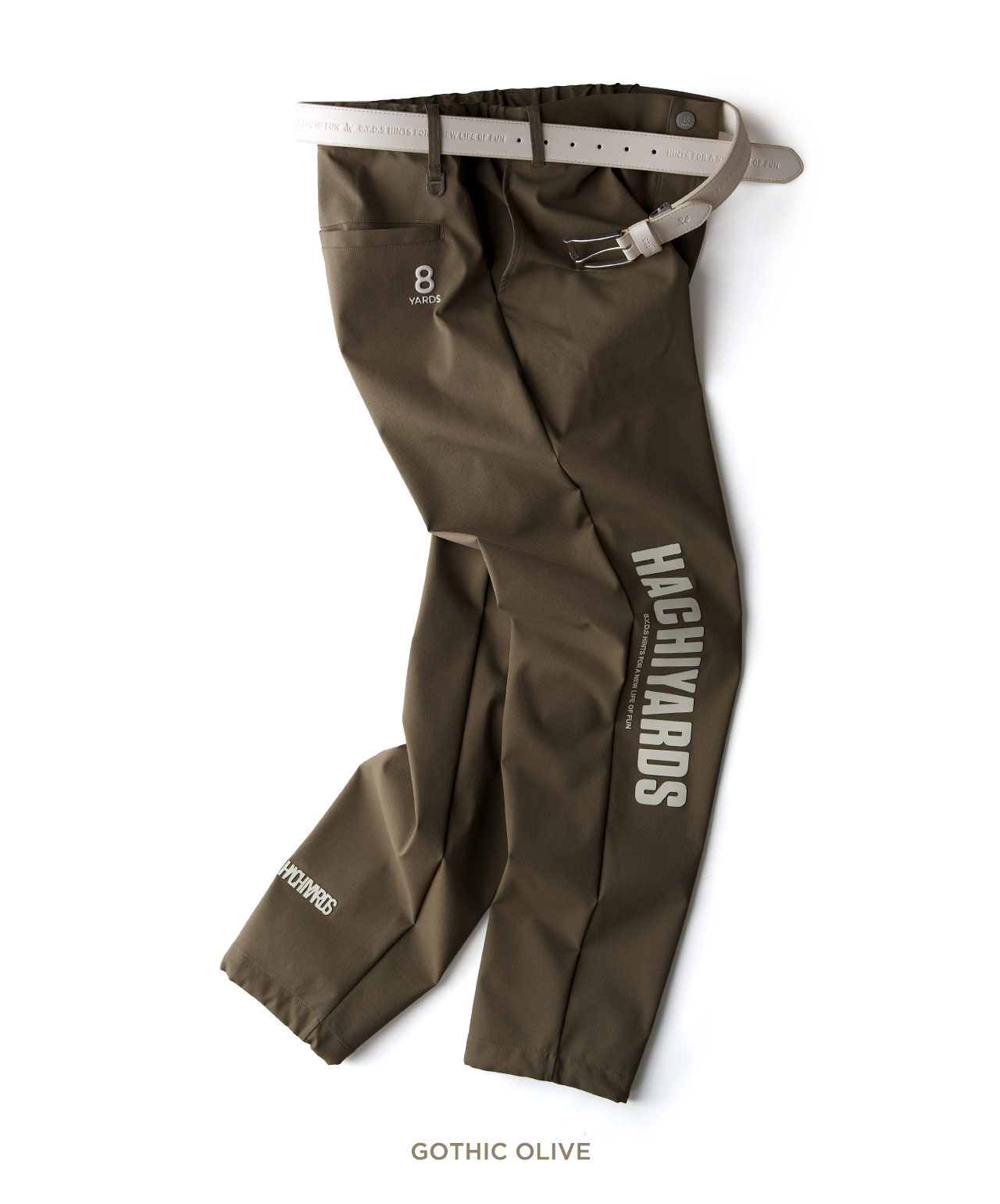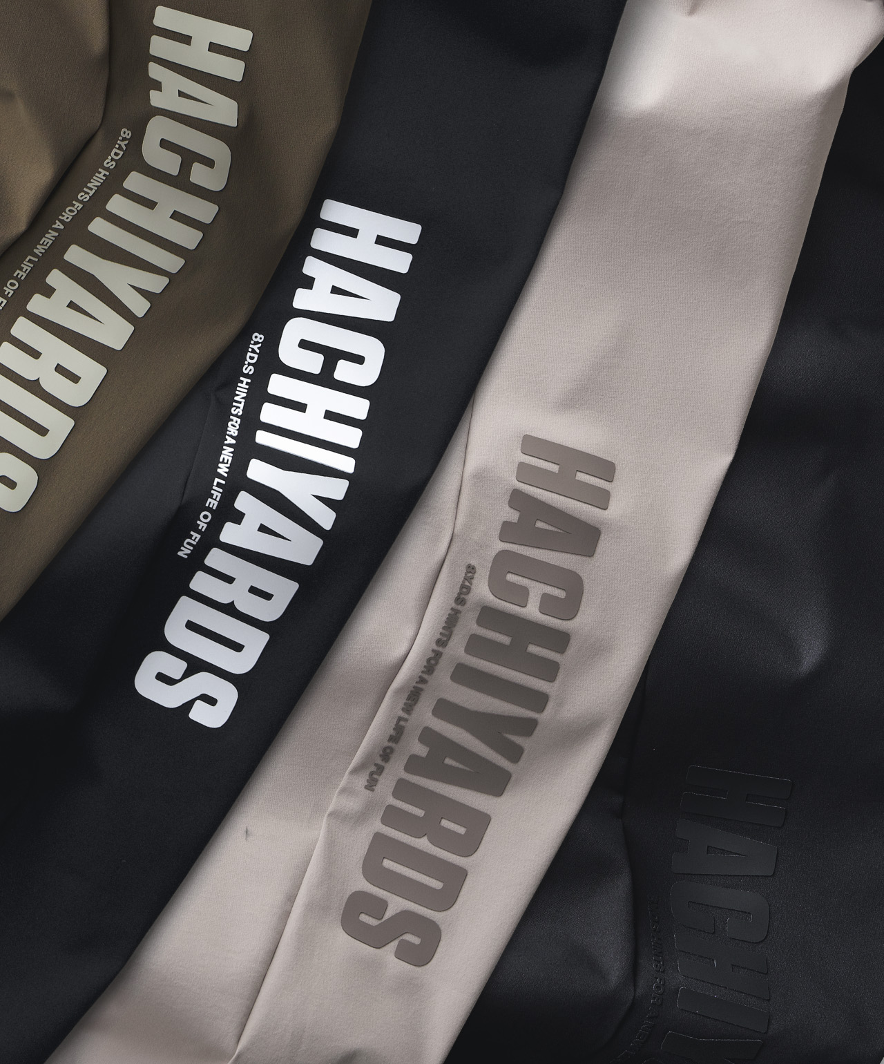 フロントファスナー上部には8YARDSのロゴ入りスナップボタンを初採用。右腿にはHACHIYARDSのビッグタイポをシリコンパーツ同系色で配置した印象的なデザイン。