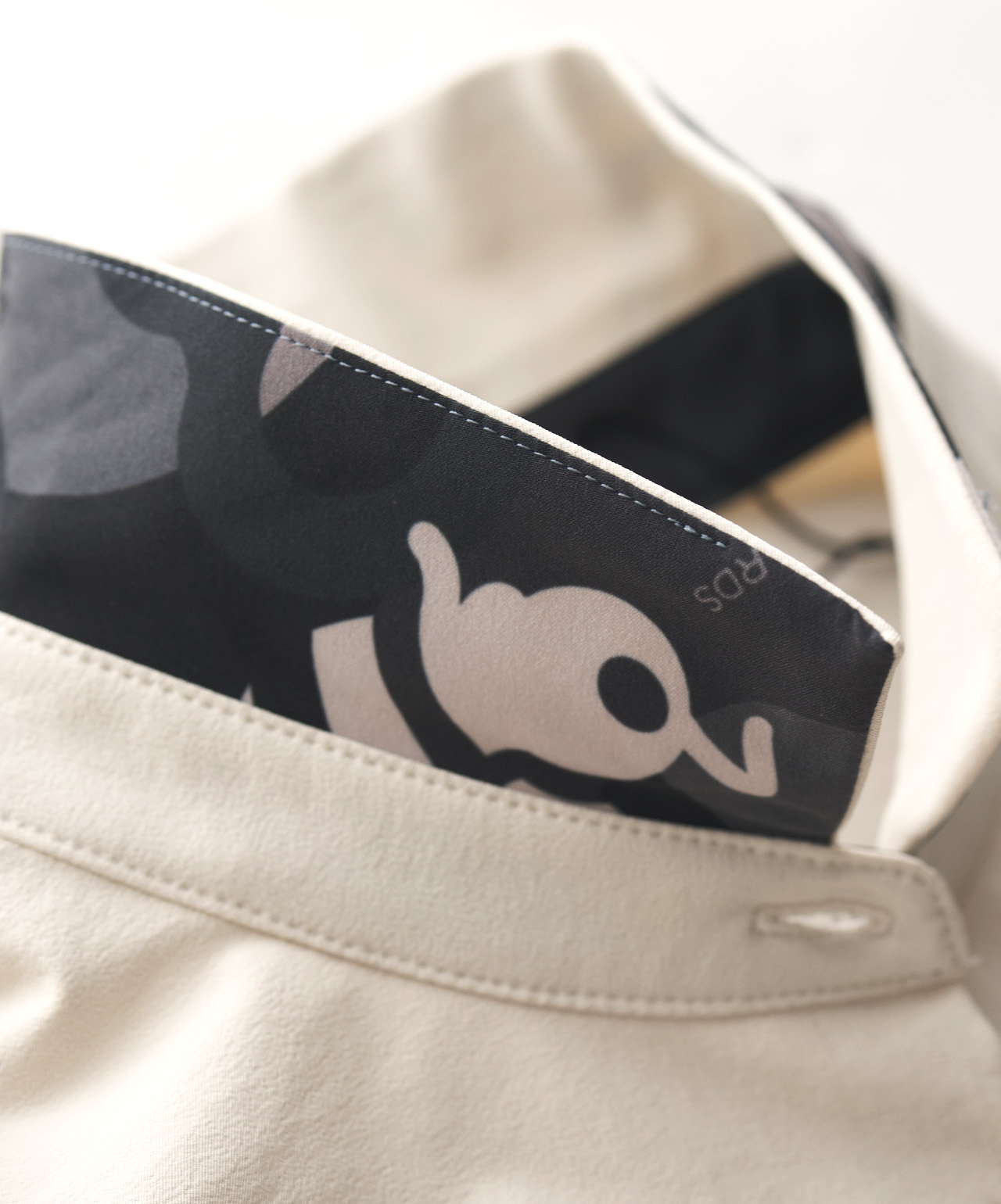 隠れた主役となる、「HACHIGRAPHパターン」は、襟裏とフラップポケットのマチ部分にオン。それぞれ色調を抑えた程よいアクセントのあるデザインで落としこみました。袖口はハーフのリブ編みで腕まくりもしっかりフィット。身幅はややゆとりのあるリラックスフィット仕様。
