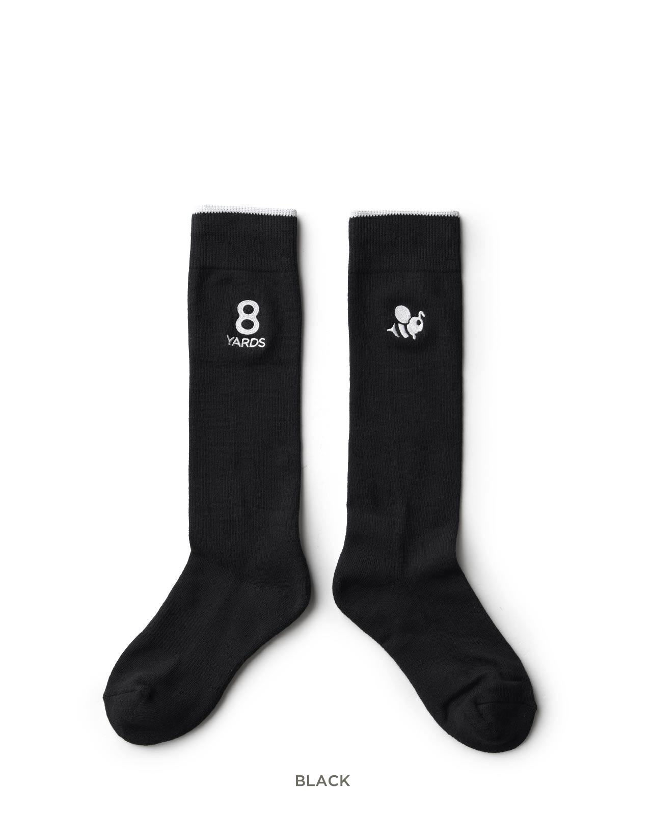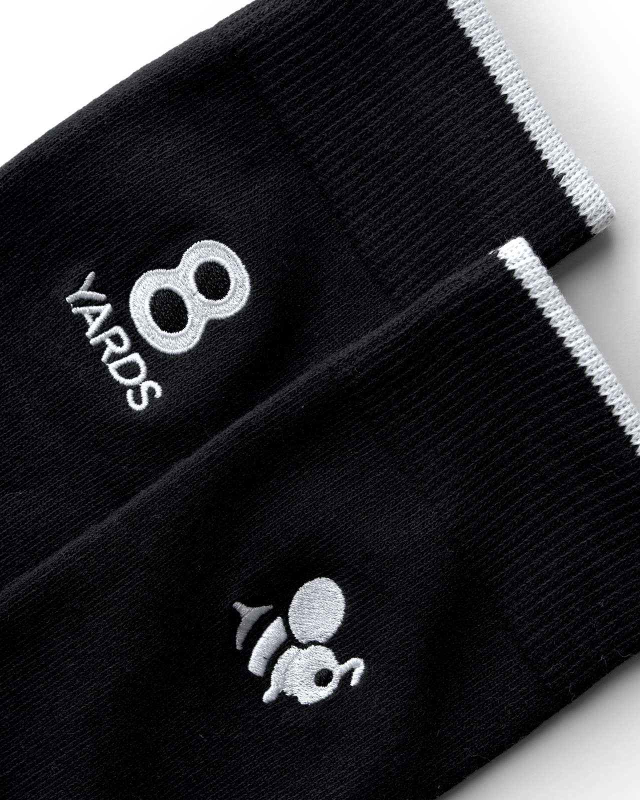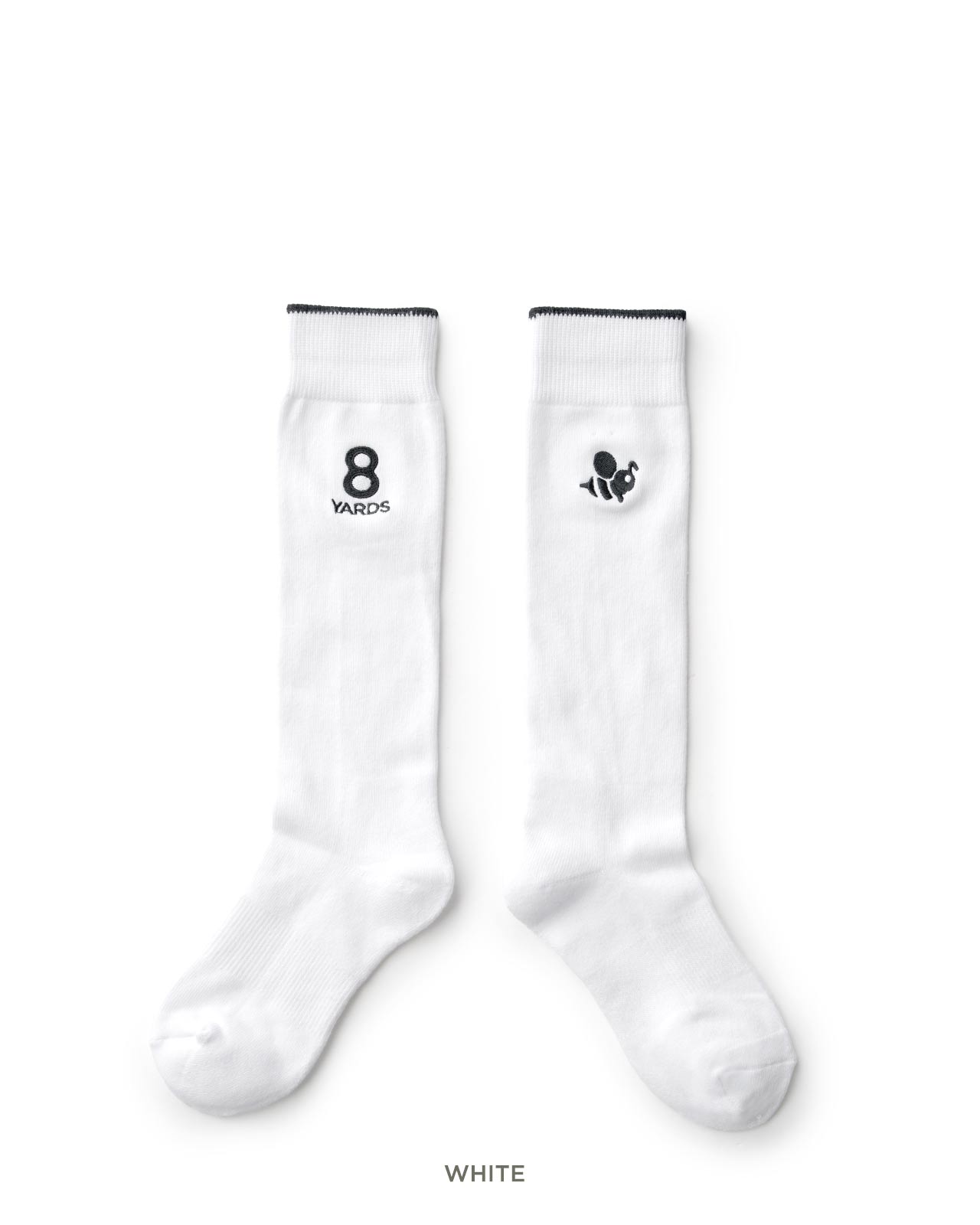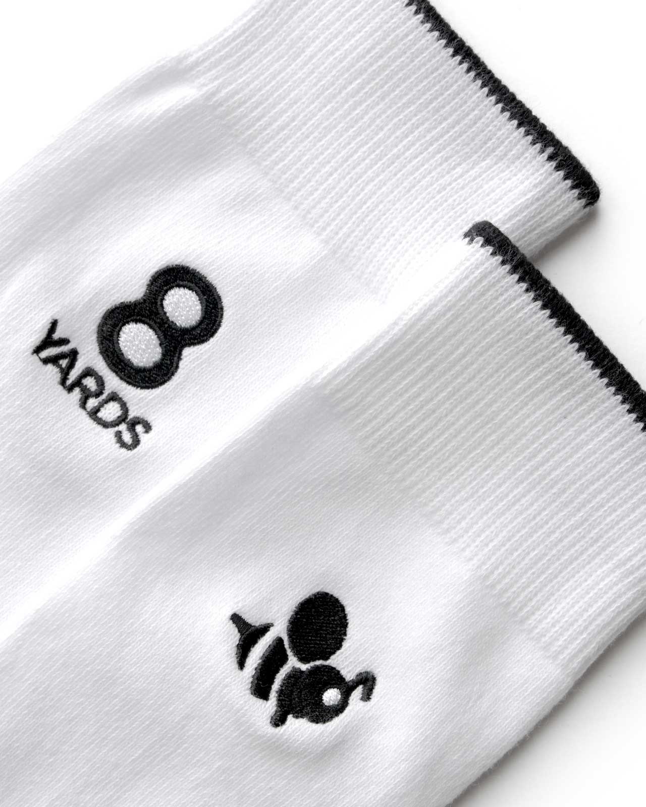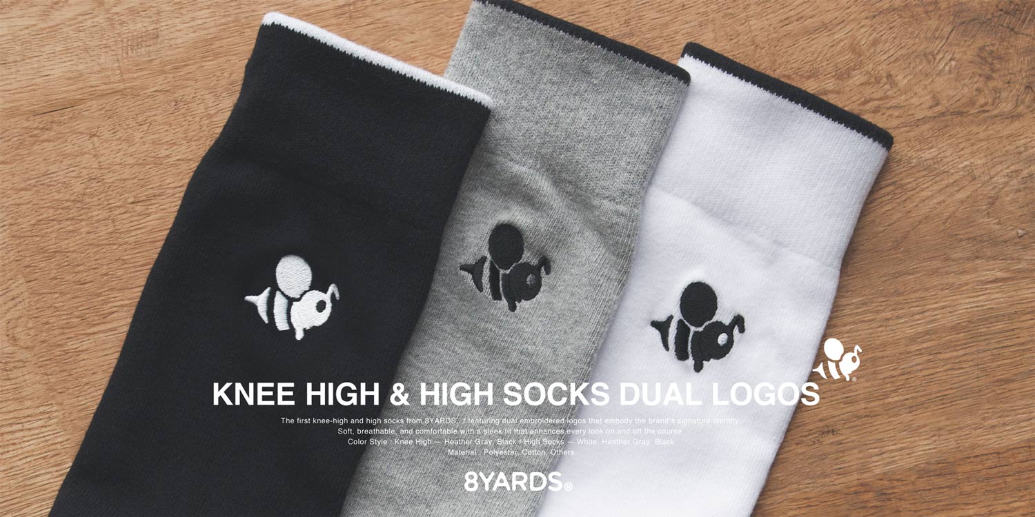 8YARDS初のニーハイソックス。左右異なる刺繍を配置したシンプルデザインで、左は8YARDSロゴ、右はソックスとしては初のCaddieBee。共にオフィシャルロゴで落とし込みました。