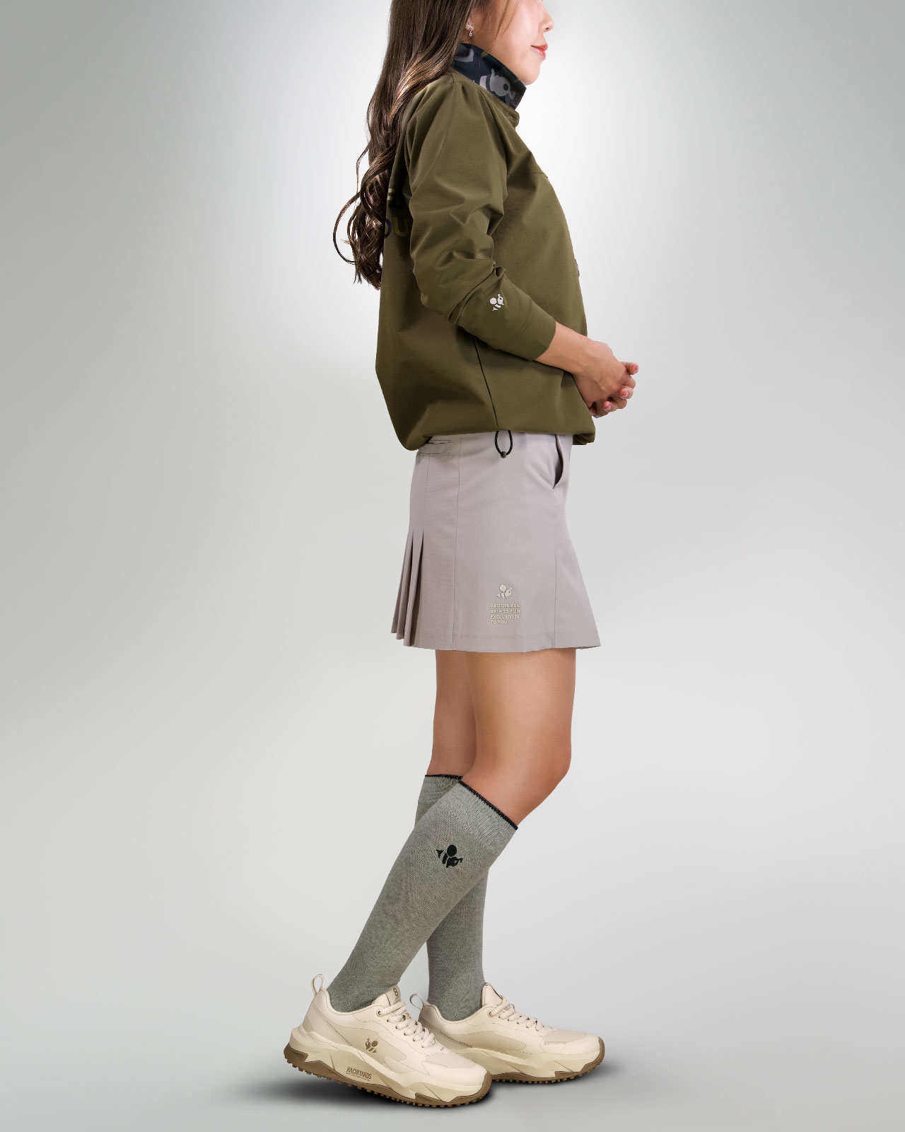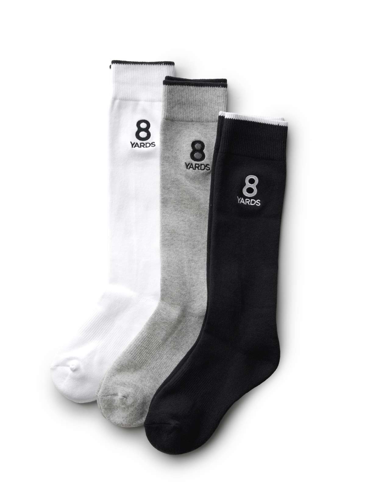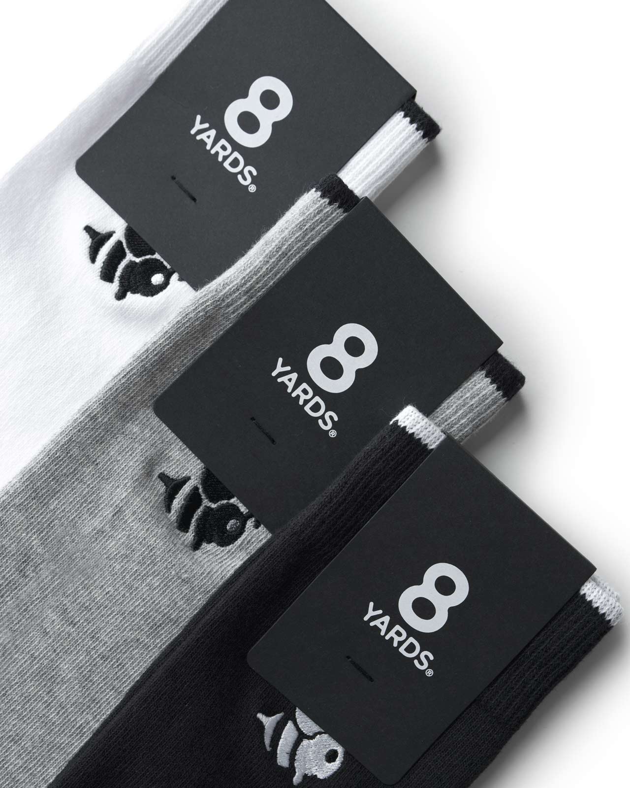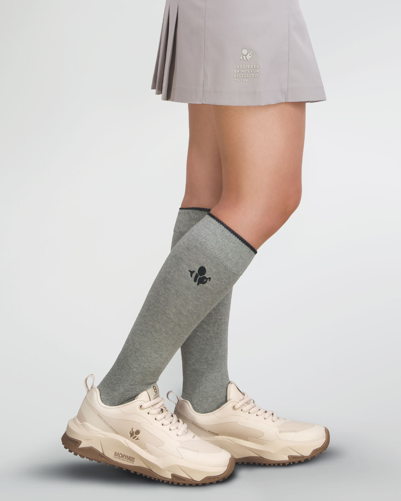 8YARDS初のニーハイソックス。左右異なる刺繍を配置したシンプルデザインで、左は8YARDSロゴ、右はソックスとしては初のCaddieBee。共にオフィシャルロゴで落とし込みました。