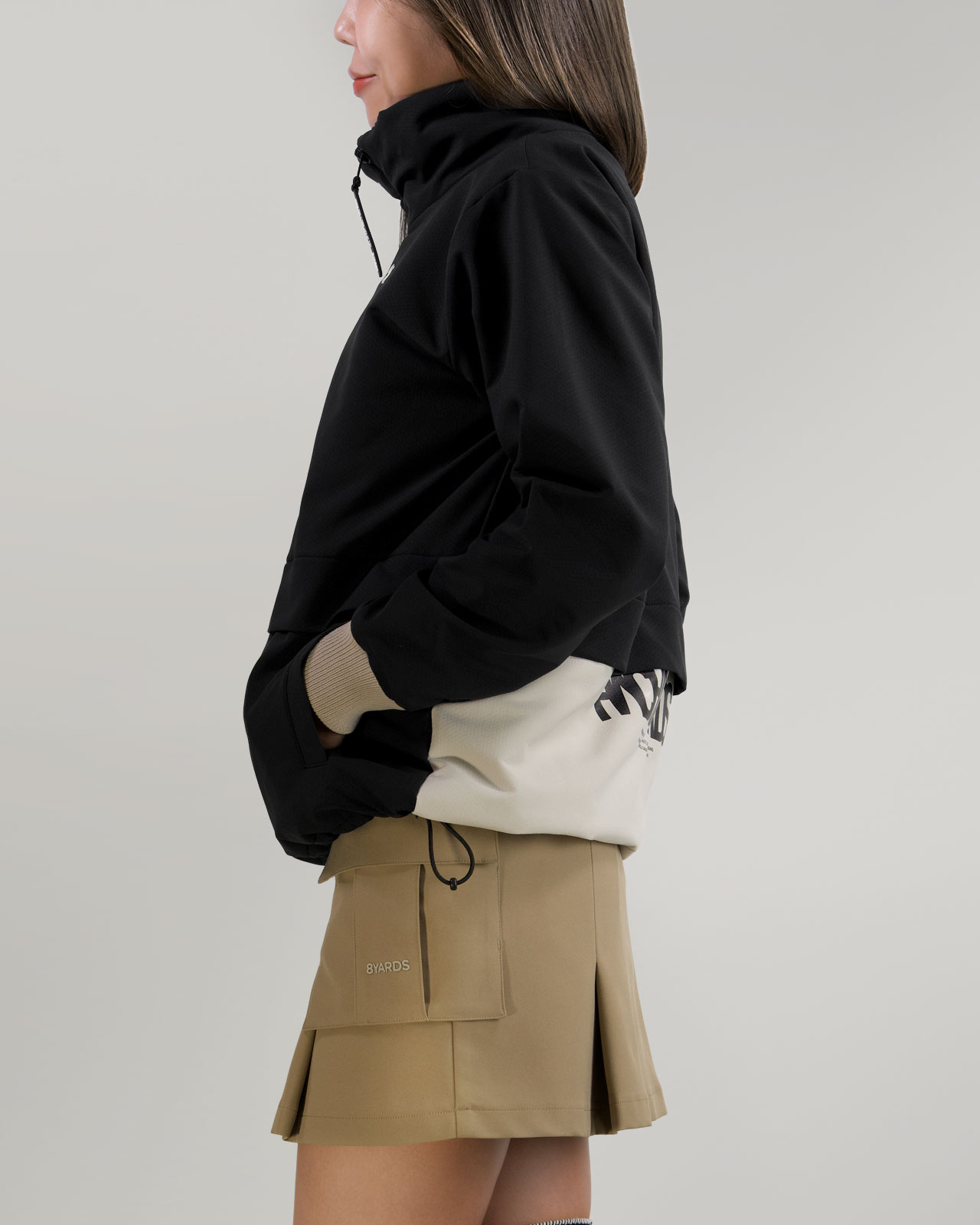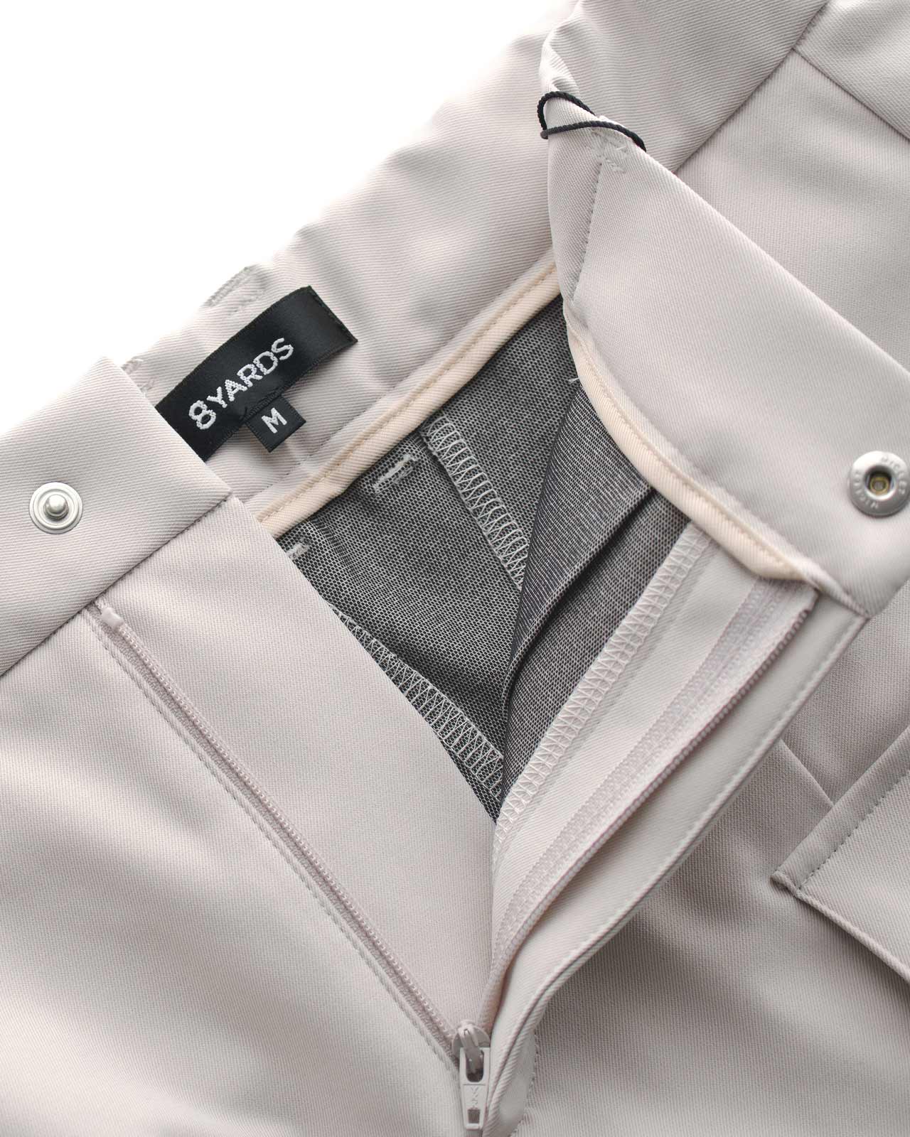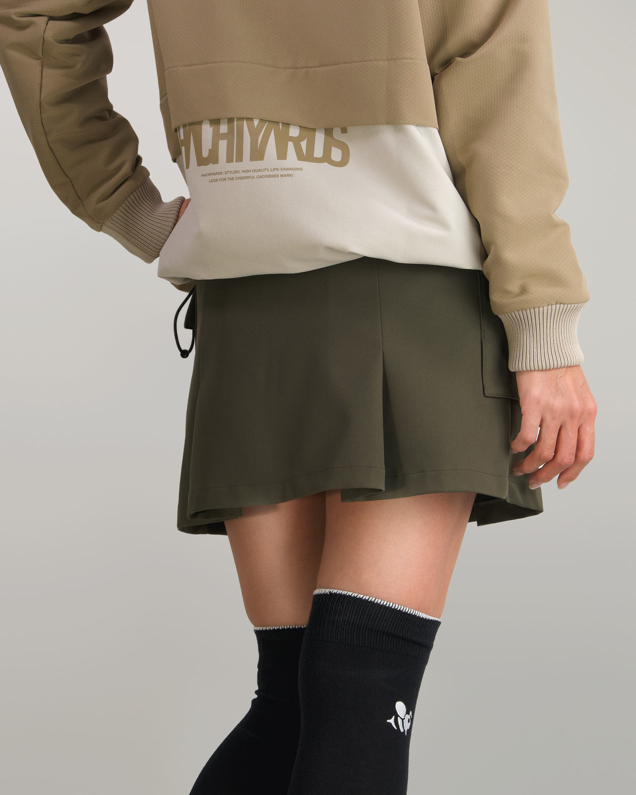 左右のポケットには、CaddieBeeと、横組の8YARDSロゴをワンポイントで配置し程よいアクセントに。