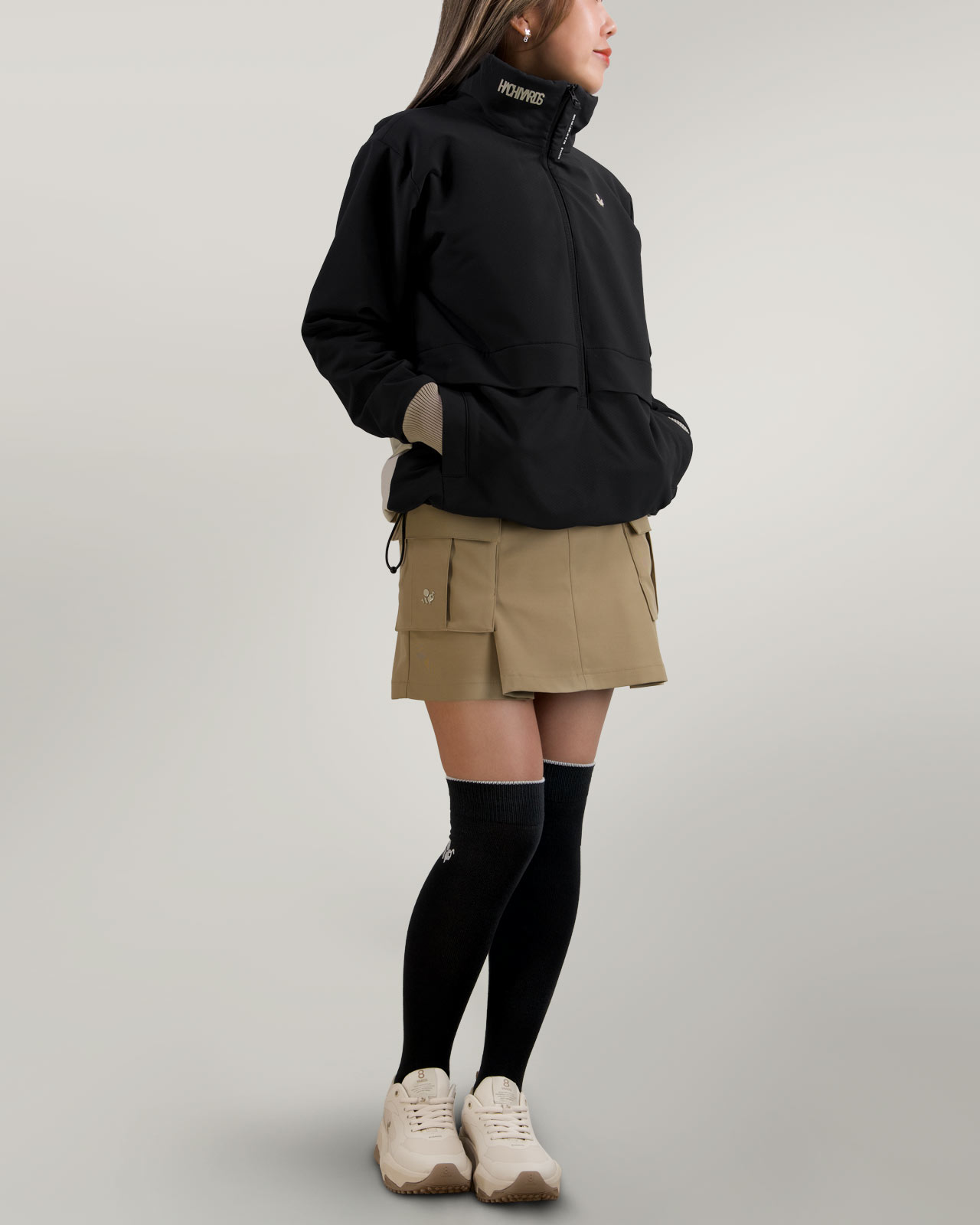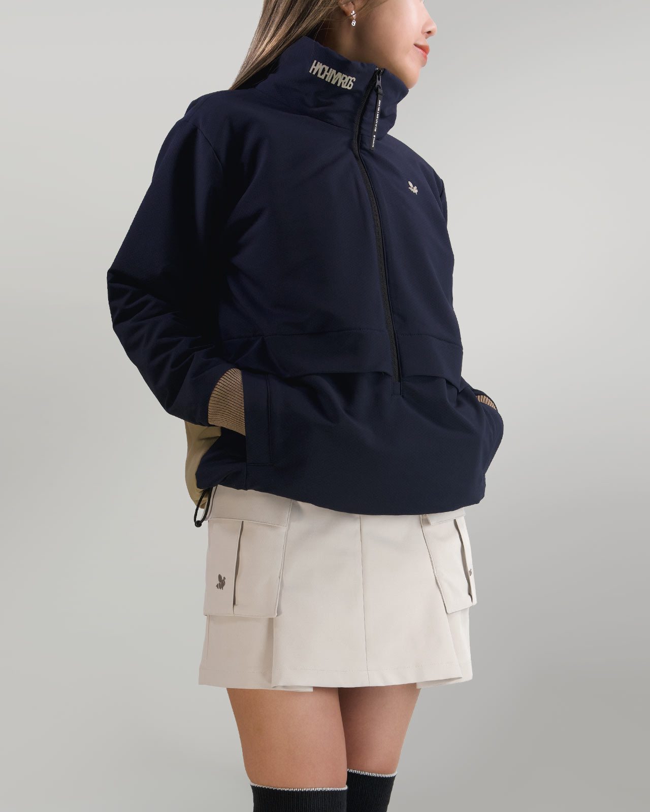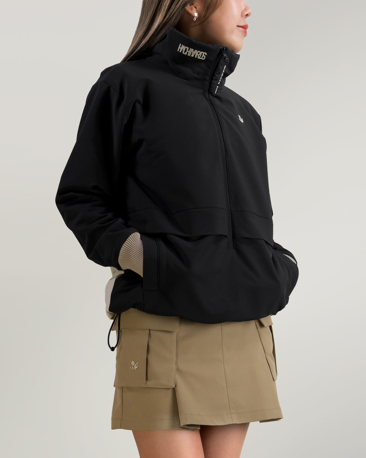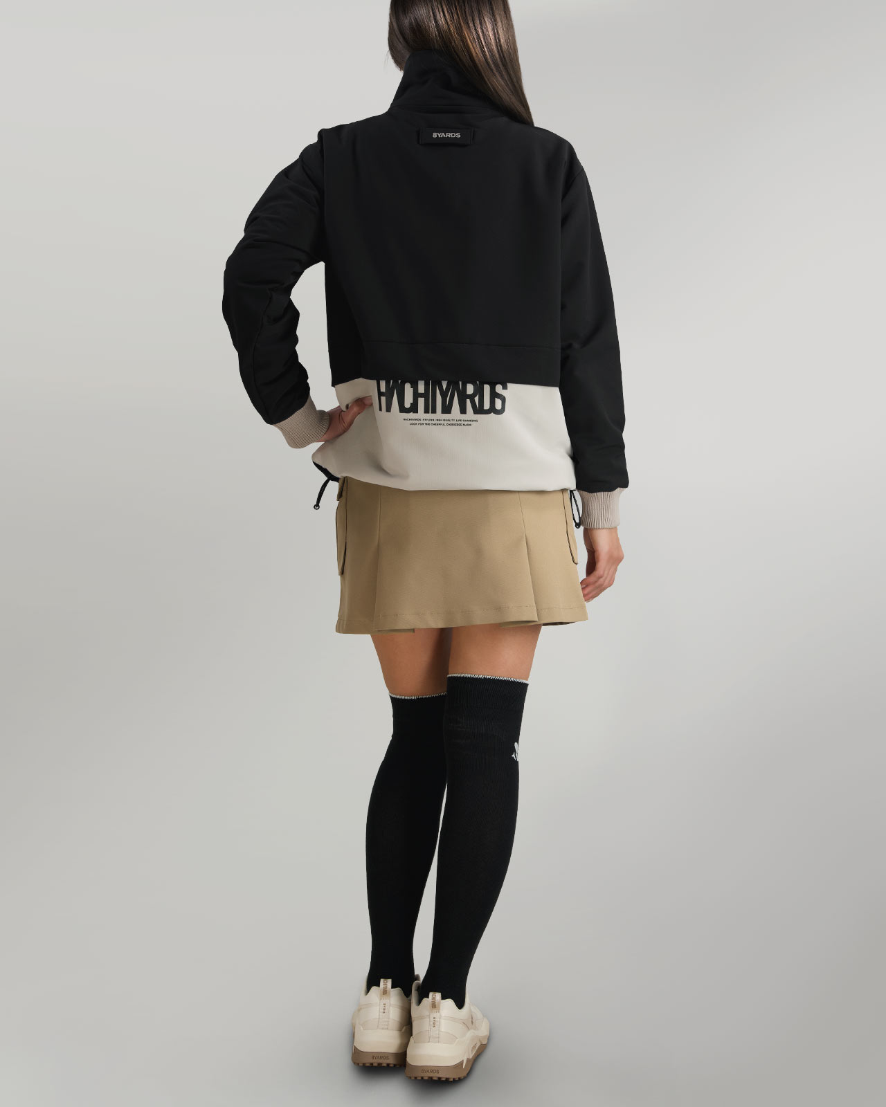 左右のポケットには、CaddieBeeと、横組の8YARDSロゴをワンポイントで配置し程よいアクセントに。