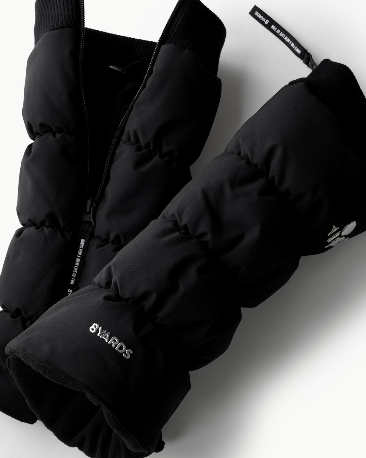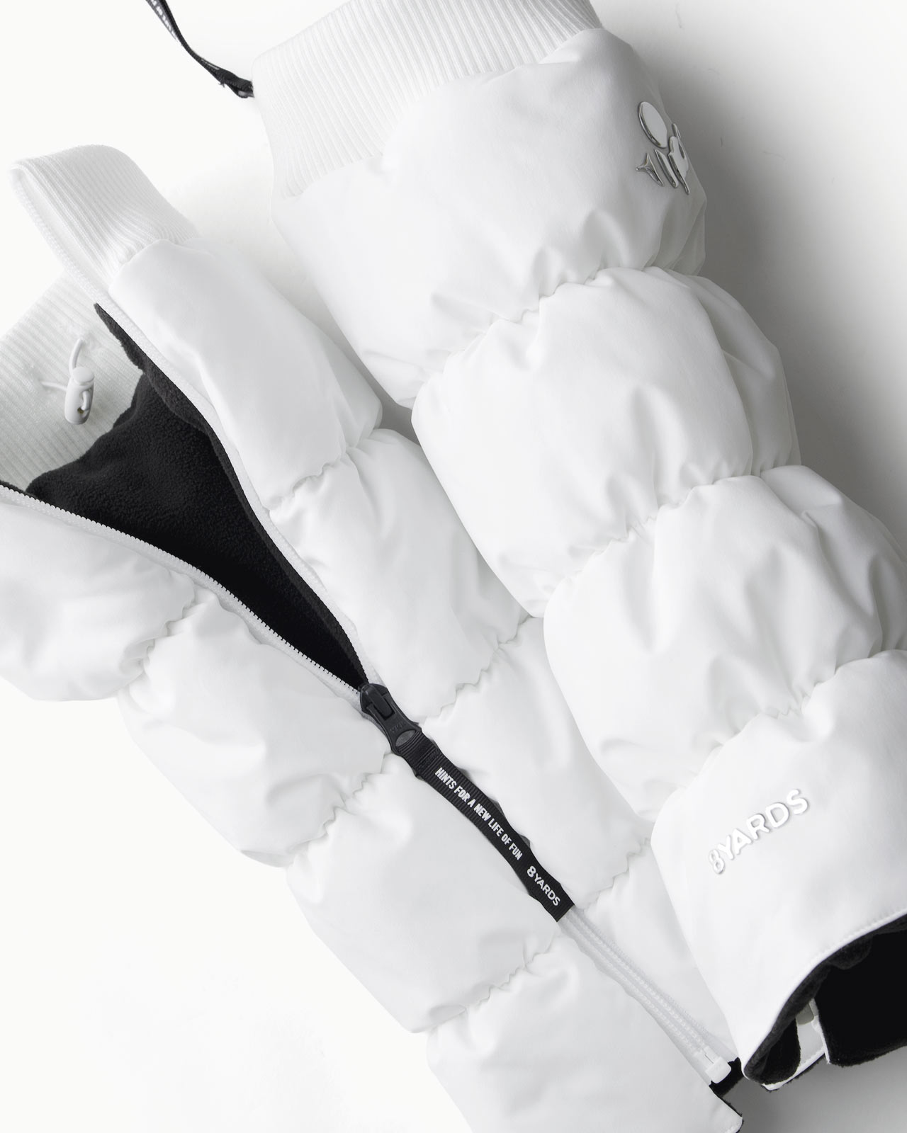肉厚な中綿と、フリースの裏地でとにかく暖か。ファスナー部分にはTAGLINEの引き手がアクセントに。内側にドローコードを付属したリブ編みの履き口でフィット感を高めました。