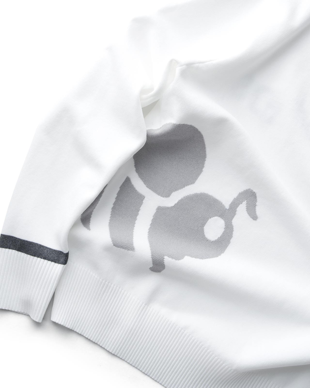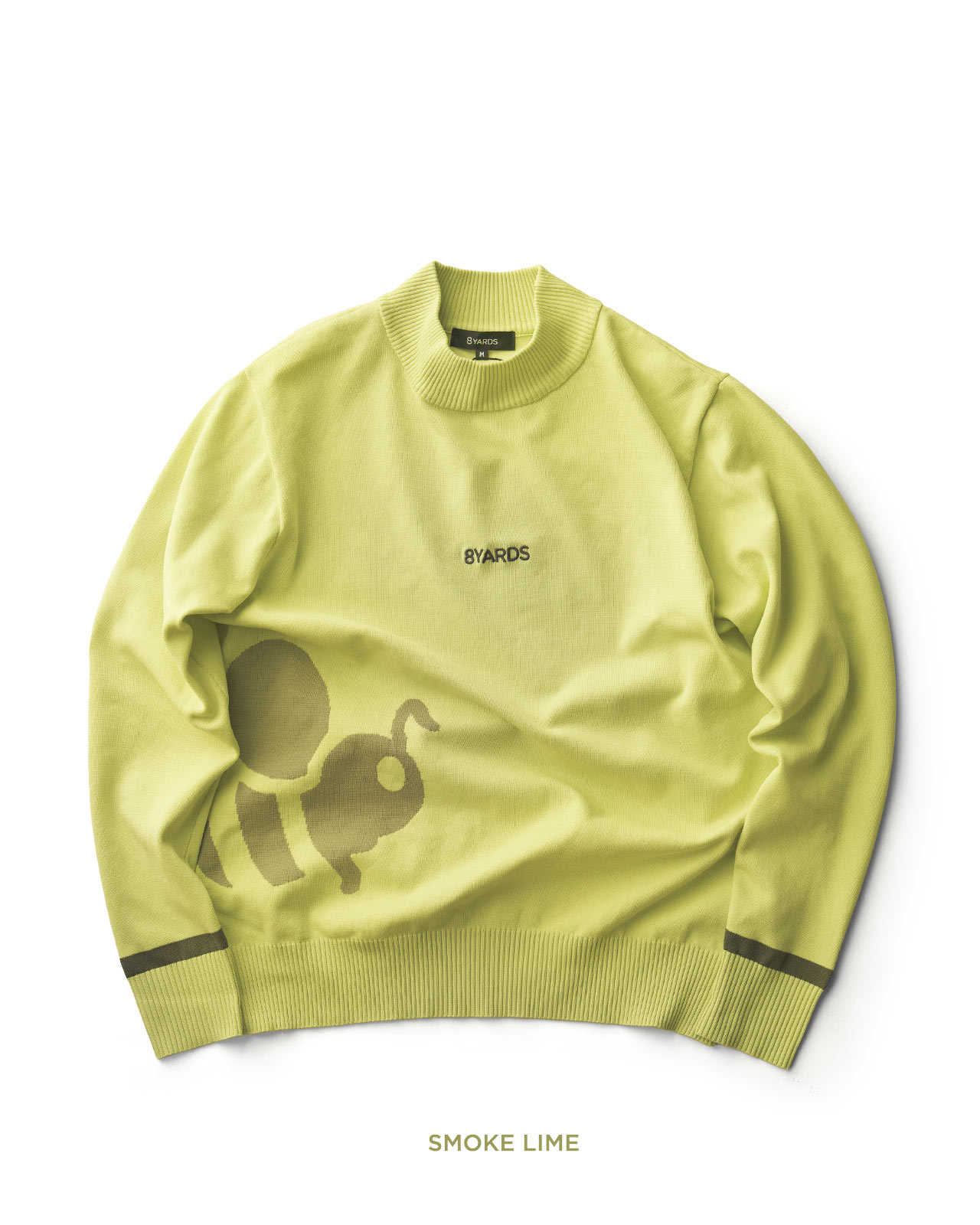フロント胸元の主役は8YARDSロゴをシンプルに刺繍でオン。右脇に大胆に落とし込んだジャカードの特大CaddieBeeは、主役のデザインながらトーンを控えめに落とし込みました。主張しすぎず、さりげないアクセントに。