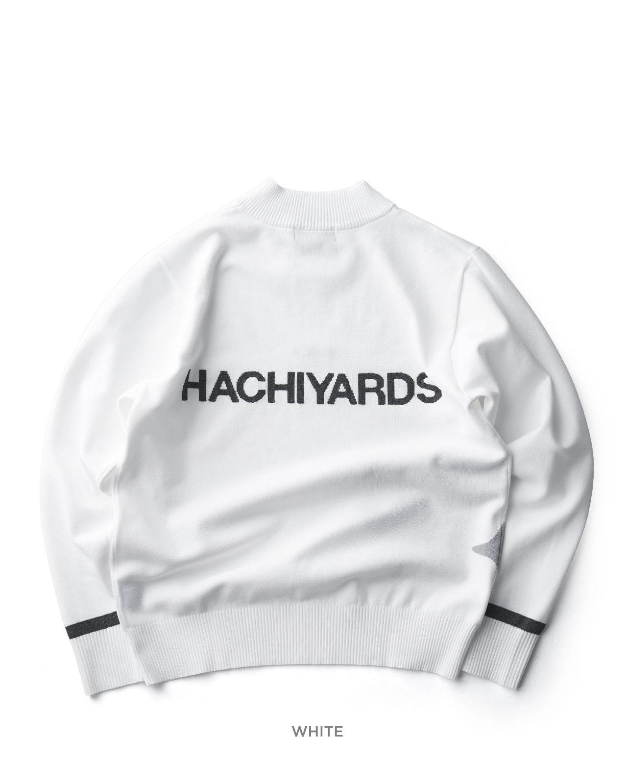 バックデザインは、ジャカードでHACHIYARDSのビッグタイポを大きめに配置。袖口のループ状の配色が全体を引き締め、シンプルかつアクティブな表情をプラス。程よいハリ感が身体のラインを拾いすぎず、美しいシルエットを形成。裾のリブはウエスト周りにスッとおさまり、一枚でコーデが完結。高いストレッチ性と軽さで着心地も抜群。ノンストレスのラウンドを実現し、シーズンレスで活用いただけます。