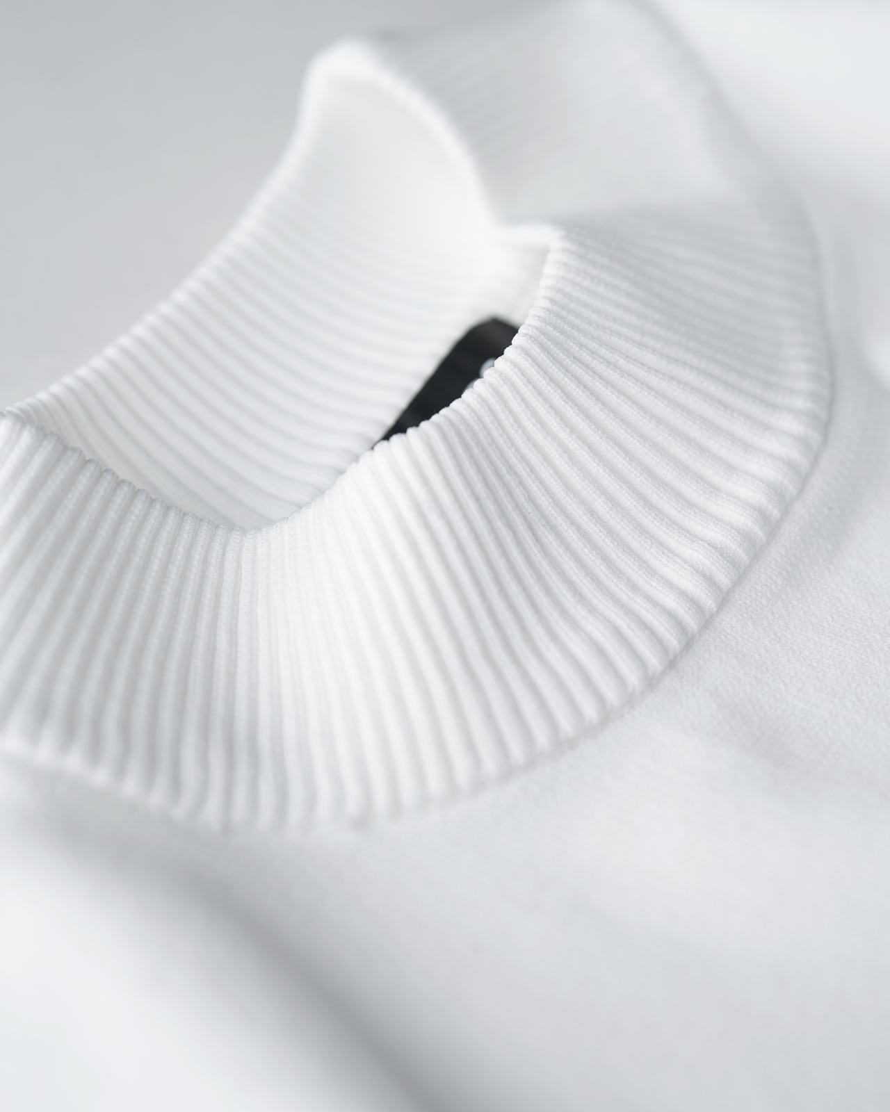 襟元は、窮屈感のないモックネック仕様で、素材感も相まって一枚でコーデが完結します。袖口と裾はフィット感を高めた設計で、腕まくりしてもスッと腕に沿い、快適な着用感が続きます。